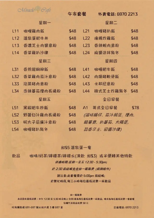 Miracle Cafe (旺角) 网址: https://s.openrice.com/QrLS0EWW700 地址: 香港旺角彌敦道691-697號永如大廈3樓697室 电话: +852 69702213
