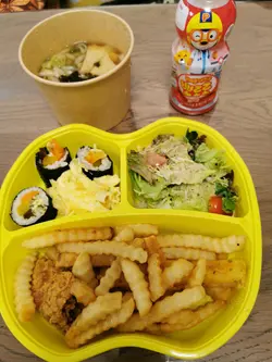 星期五无饭煮妇又嚟啦! 晚餐叫外卖, 试下呢间韩国野, 叫咗个牛肉紫菜饭卷, 一份儿童餐 ( 有鱼饼汤乌冬, 沙律, 小饭卷配炒蛋, 炸薯条配炸鸡), 辣猪肉便当 (有小菜三种, 炒粉丝, 汤, 辣炒年糕, 无骨炸鸡2件)。儿童都ok, 个盒几靓, 仲有一支果汁送! 便当都几大盒, 年糕, 炒辣猪肉都好够辣味😋, 佢啲饭好有米香, 好好食, 不过炸鸡干咗啲! 🤔牛肉饭卷, 牛肉几好味, 唔会靭, 入面包住黄萝卜, 青瓜, 蛋丝, 红萝卜配埋紫菜饭, 口感好丰富, 劲饱肚。👍🏻我约6:00叫的, 叫完仲有折, 全单$203.2都算平! 可以再叫。