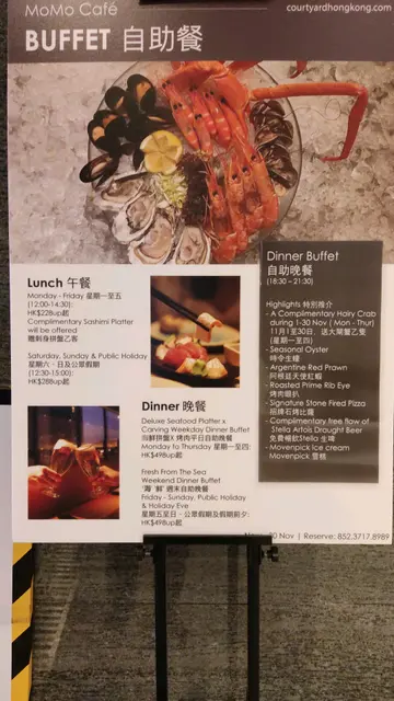 因为屋企喺西环,所以拣咗呢间同屋企人食buffet。鱼生,寿司,热食,冷盘都齐,任食movenpick雪糕系重点。服务员更有礼貌。5月中去左MoMo's cafe同屋企人补足母亲节,一行六人,buffet 六点半开始。海鲜冻食都好新鲜,冻虾非常爽口,长脚蟹啖啖肉。最重要系有即开生蚝,每次可以拎两只,慢慢食. 热食都有青口,手工意粉,仲有即煮意大利饭同埋洋葱汤。同平时既buffet嘅菜式有啲唔同。价钱非常亲民,长者仲要有折。适合同一家人一齐过庆祝。