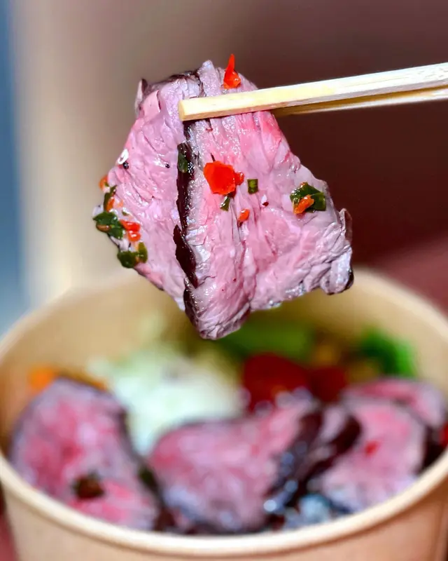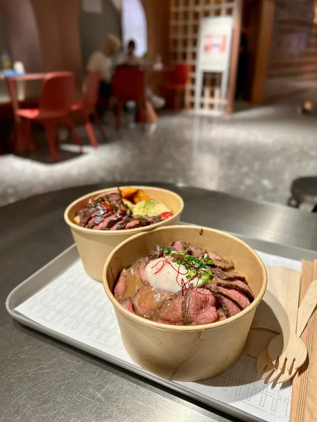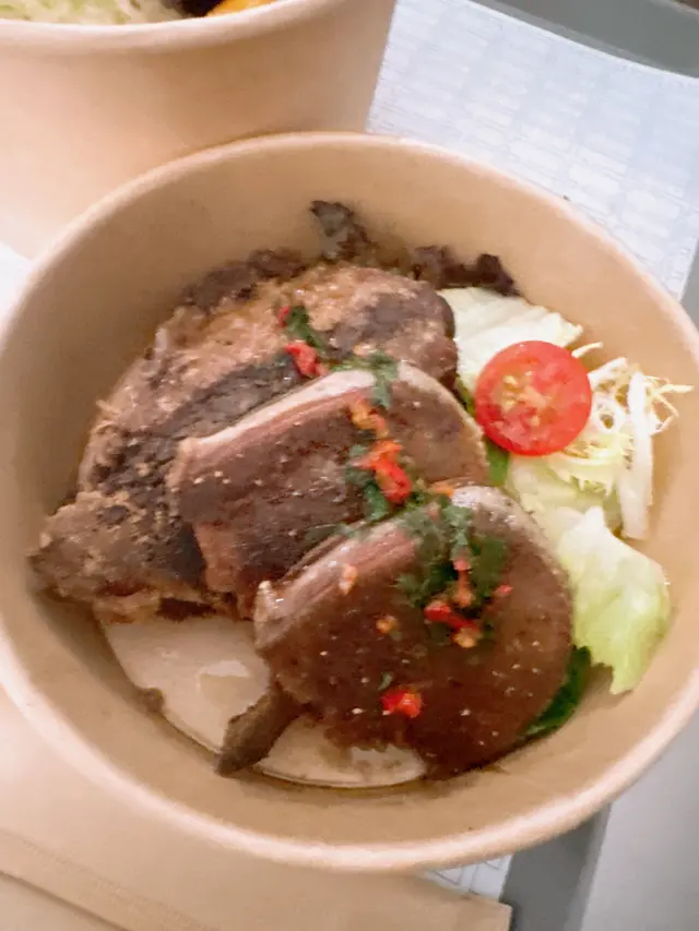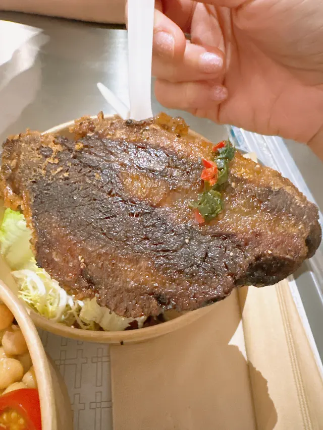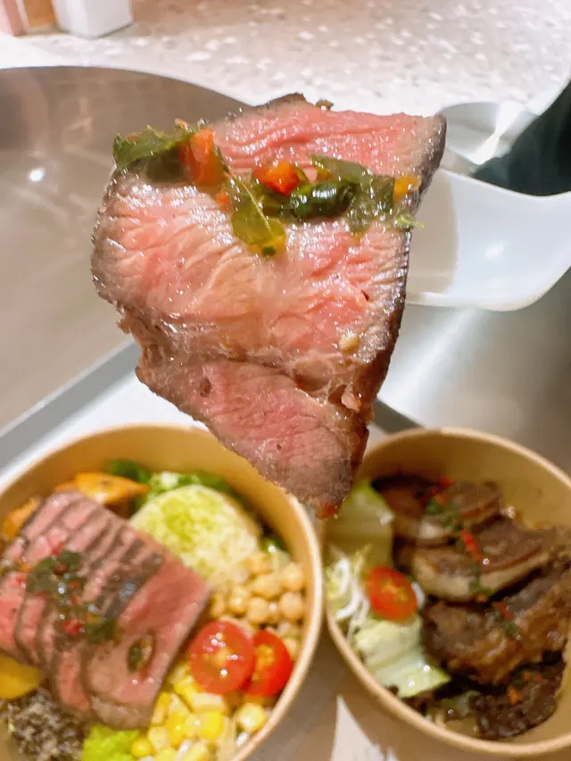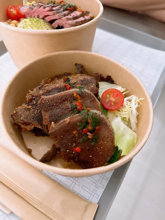 係重慶大廈隔離嘅慶方群英薈萃 呢個foodcourt唔單止有出名嘅peekapoke 蘭芳園 仲有最近係threads好hit嘅moos(雖然我都好掛住以前嘅犀牛犀牛)係foodcourt行一圈已經聞到燒牛嘅脂肪香味 隔離都有間泰國野好香!🥩燒封門柳牛肉+日式沙律💰60+25首先讚下個牛肉真係燒得好出色 四周有碳烤嘅靚靚美拉德棕色 入面就係半熟牛肉嘅粉嫩紅色唔需要調料 已經燒得鹹香味好足夠 當然如果需要都有海鹽、黑胡椒等可以自助添加 牛肉肉質鮮美 好嫩 肉汁都多日式沙律提供左both 蔬菜同碳水 仲有額外嘅蛋白質薯仔沙律係健康ver 冇咩cream嘅加入會偏酸小小 燒蕃薯就硬身 但夠甜好出色粟米粒同藜麥都幾增加咬口蔬菜主要靠沙律菜 撈勻柚子油醋汁都幾有風味!仲有當季無花果同藍莓 都好甜最後鷹嘴豆除左增加飽腹感 蛋白含量都高~🥩牛肉二重奏(燴牛舌拼燴牛面頰、溫泉蛋)💰88飯嘅話主要係有唔同肉嘅選擇+溫泉蛋+炒菇同埋焦糖洋蔥 所以一定唔會出錯!牛舌真係好嫩 雖然2塊但每塊都好大 而牛面頰就嫩到可以一條條脫落 有埋連著牛筋嘅部分 增加左軟淋淋嘅口感菇同洋蔥炒得都超級香 係好啱撈飯!整體野食香得來係對得住價錢 又多種類又好味 呢個foodcourt整體環境都好舒服 偏寧靜而且好多食物選擇!…查看更多