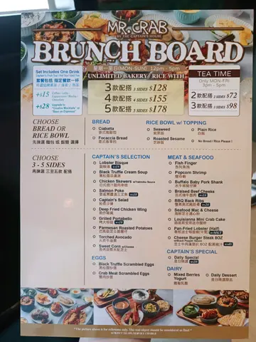 星期日假期去咗港岛搭叮叮慢活一翻休息身心兼揾嘢食,去到修顿球场,见到对面有间2层高的餐厅Mr. Crab By the Captain's House,就入去试吓。侍应们都好有礼貌👍🏻餐牌上有三款Brunch set可以拣,因为未食午饭,我哋每人都拣咗$178可以选5款配搭的set,即系我哋可以拣10款嘢食、两款面包或者饭,同埋两杯嘢饮。🍹两杯果茶+意式拖鞋包和意式香草包杯果茶意想不到咁好饮,有少少水果粒,味道似杂果宾治,茶嘅香气十分芬芳。拖鞋包和香草包咸咸香香好好食。🍗10款嘢食,两个黑松露忌廉汤、日式烧汁鸡肉串烧、夏威夷酱渍三文鱼、脆炸鸡翼、黑松露炒蛋、水牛城猪仔髀、慢煮美式猪肋骨、海鲜芝士通心粉,和路易斯安娜迷你蟹饼。🍲黑松露忌廉汤,不得不赞,浓度适中,打碎了的菇菇使忌廉汤感觉更加高贵。🍢日式烧汁鸡肉串烧肉嫩多汁,大大粒好有诚意。🐟夏威夷酱渍三文鱼真的超级开胃,三文鱼沙律菜都非常新鲜。🍗脆炸鸡翼,唔会炸得太热气。🍳黑松露炒蛋又是满分之作,有蛋香。🍖水牛城猪仔髀和慢煮美式猪肋骨,酱汁超浓而且多,够晒入味。🥘海鲜芝士通心粉,中间有少少烧焦金黄色,外脆内软,入面有八爪鱼仔同埋其他海鲜,每口都是满满幸福感。🦀迷你蟹饼有少少似日式可乐饼的感觉,配上酱汁相当可口,绝对可以追加。🤍餐厅环境优美洁净,食完饭,身心得到充分休息,为假期画上完美句号。…查看更多