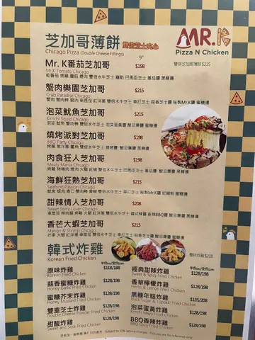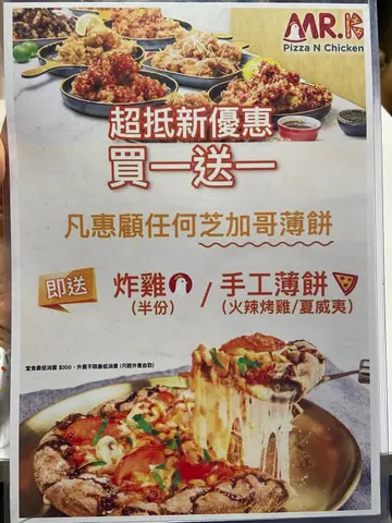 Mr. K Pizza & Chicken登龙街平时去登龙街都系食开𠮶几间餐厅食到有啲厌。今次见到间又有炸鸡又有pizza食嘅餐厅,一次可以满足两个愿望🧞♂️ 炸鸡外层嘅炸衣又薄又脆,包住里面juicy嘅无骨鸡髀肉。炸鸡可以选择半份或一份,我地两个人食半份就啱啱好👌 呢到嘅pizza系手工pizza ,比起平时食到嘅pizza皮更加松软,仲有淡淡嘅黑糖香味,亦放上满满嘅mozzerella。Pizza馅系韩式辣鸡,再加上火箭菜一起食唔会太heavy。系一间好适合放工同朋友聚会,饮吓啤酒食吓炸鸡+ pizza嘅地方…查看更多