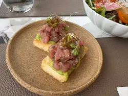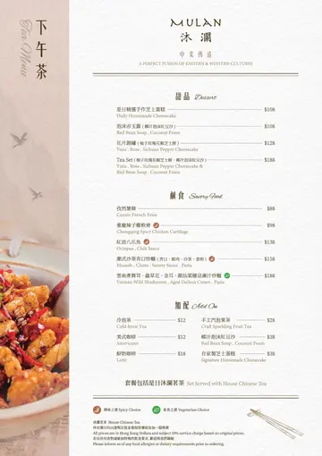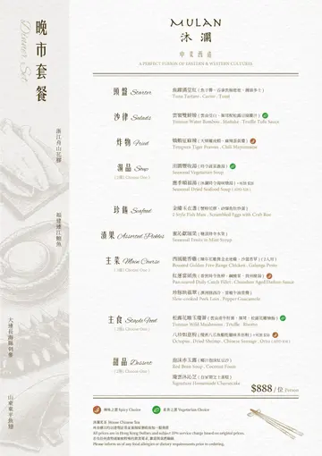 With the big typhoon coming to HK, everyone was rushing back home after work on this Monday evening. Going out for dinner before the signal no. 8 which would be hoisted later in midnight, we came to Mulan, in Harbour City, to try out their contemporary Chinese cuisine from their acclaimed female chef Ng Mung-Lam.Seated at a table on the window side, the harbour view at dusk was mind-blowing. The restaurant has a simple design, tidy and neat, offering customers a friendly and comfortable ambience. We ordered the Dinner Set ($838 each), which showcases Chef Ng’s approach of fusion cuisine incorporating Chinese ingredients and Western techniques.The starter is Tuna Tartare, with Caviar and Toast. The tuna is seasoned beautifully, with the French caviar adding a savoury taste to enhance the flavours. The toast on the side is also very crunchy, overall offering an impeccable start of the dinner.Next comes Yunnan Water Bamboo, Maitake, Truffle Tofu Sauce. Even though the water bamboo has a bit of bitterness, when combining with the maitake, and the truffle tofu sauce the flavours become more harmonized.The third course is Tempura Tiger Prawns with Salted Egg Yolk Sauce. The prawn is deep-fried with a thin batter in tempura style, paired with salted egg yolk sauce that is not too rich or heavy. The deep-fried shredded taro on top further adds to the enjoyment. For the soup, there are two choices. I go for Seasonal Vegetable Soup which is Mushroom Soup, with the blended mushroom offering rich flavours, the most Western-style of all dishes. My wife has the equally tasty Seasonal Dried Seafood Soup ($28 supplement), of more traditional style.The fifth course features Fish Maw in Two Styles. Prepared on the side, the fish maw has been used to make a corn soup together with conpoy, and also added in the scrambled egg to serve on the plate, with some truffle shaved on top. The flavours are good, but the dish is not hot enough in temperature.To transition to the main course, we are served Xinjiang Melon in Mint Syrup. An interesting small bite, the melon is not too sweet, with the refreshing taste of the mint helping to remove the flavours in the mouth to prepare for the next course.The seventh course is Roasted Golden Free-Range Chicken with Galanga Pesto, which is meant to share for two. The half chicken is beautifully roasted with golden colour skin, tender and juicy in flesh. The pesto is rich in taste, also there are also three different chili sauce on the side as condiment. The side dish includes sweet corn and French beans which are dusted with garlic salt.There are again a few choices for the eighth course, and I opted for Abalone and Sesame Sauce Flat Udon ($38 supplement). The udon has a pleasant al dente texture, with the sauce adding rich sesame flavours. The abalone is also nicely done and not rubbery. My wife has picked Yunnan Wild Mushroom Risotto which is also very good.For dessert, we both have chosen Mangosteen Sorbet with Yunnan Snow Swallow ($28 supplement). The sorbet is refreshing, not sweet but showing plenty of nice mangosteen taste. It is the first time I have tried dessert featuring this fruit. The snow swallow has a good bite to give contrast in texture. A delicate and nice one.Service is nice, but I hope the staff can give more introduction to the ingredients and dishes. The bill on the night is $2,088. A reasonable price, and consider the overall experience it is worth returning again, perhaps to pre-order the special menu which has some dishes I want to try.…查看更多