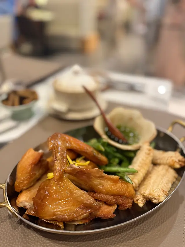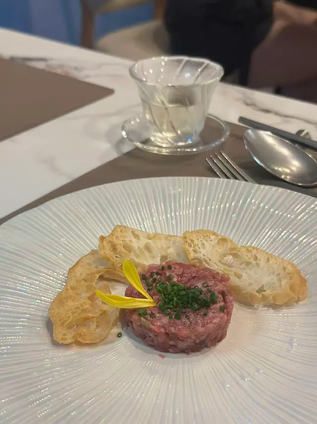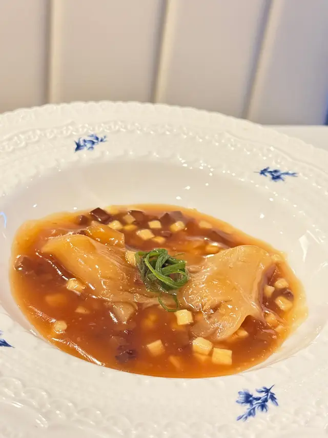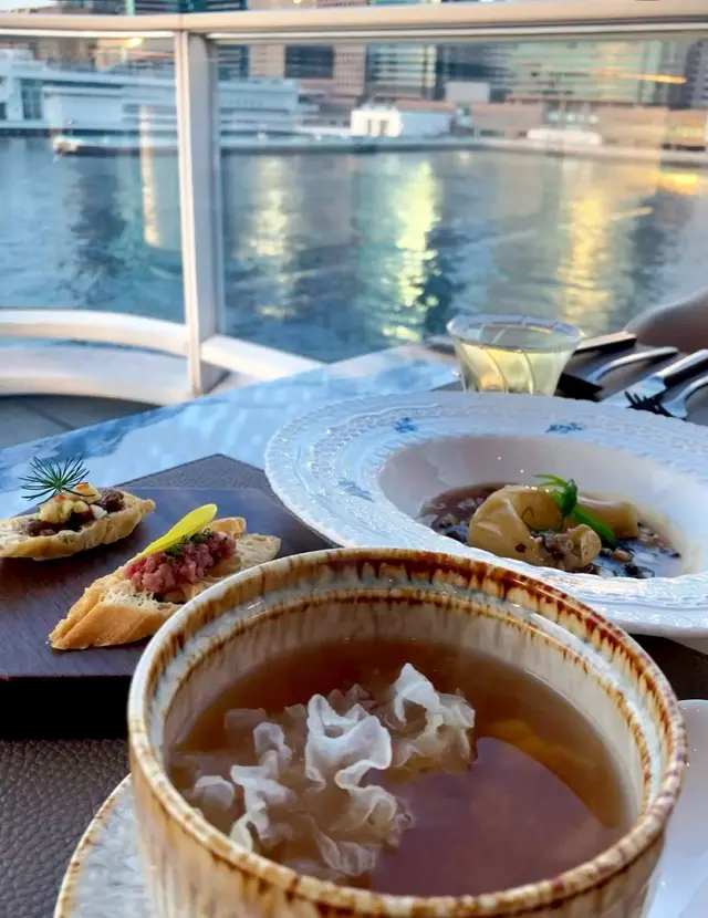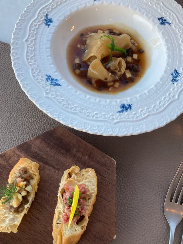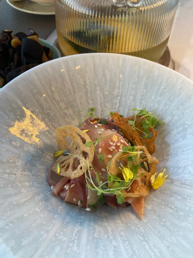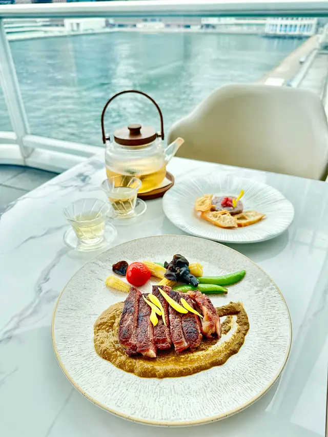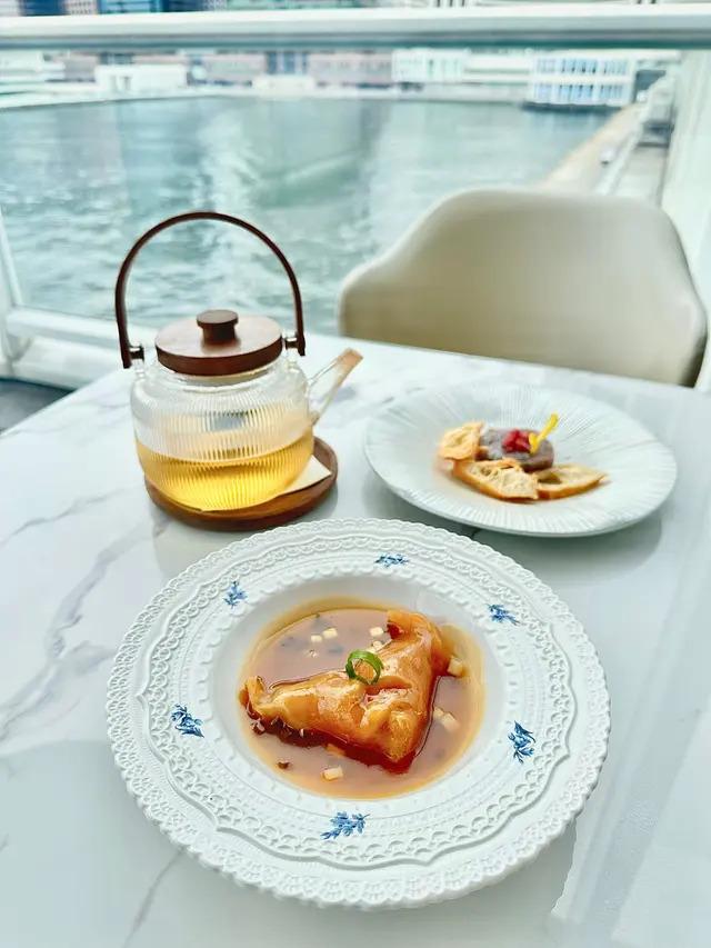 With the big typhoon coming to HK, everyone was rushing back home after work on this Monday evening. Going out for dinner before the signal no. 8 which would be hoisted later in midnight, we came to Mulan, in Harbour City, to try out their contemporary Chinese cuisine from their acclaimed female chef Ng Mung-Lam.Seated at a table on the window side, the harbour view at dusk was mind-blowing. The restaurant has a simple design, tidy and neat, offering customers a friendly and comfortable ambience. We ordered the Dinner Set ($838 each), which showcases Chef Ng’s approach of fusion cuisine incorporating Chinese ingredients and Western techniques.The starter is Tuna Tartare, with Caviar and Toast. The tuna is seasoned beautifully, with the French caviar adding a savoury taste to enhance the flavours. The toast on the side is also very crunchy, overall offering an impeccable start of the dinner.Next comes Yunnan Water Bamboo, Maitake, Truffle Tofu Sauce. Even though the water bamboo has a bit of bitterness, when combining with the maitake, and the truffle tofu sauce the flavours become more harmonized.The third course is Tempura Tiger Prawns with Salted Egg Yolk Sauce. The prawn is deep-fried with a thin batter in tempura style, paired with salted egg yolk sauce that is not too rich or heavy. The deep-fried shredded taro on top further adds to the enjoyment. For the soup, there are two choices. I go for Seasonal Vegetable Soup which is Mushroom Soup, with the blended mushroom offering rich flavours, the most Western-style of all dishes. My wife has the equally tasty Seasonal Dried Seafood Soup ($28 supplement), of more traditional style.The fifth course features Fish Maw in Two Styles. Prepared on the side, the fish maw has been used to make a corn soup together with conpoy, and also added in the scrambled egg to serve on the plate, with some truffle shaved on top. The flavours are good, but the dish is not hot enough in temperature.To transition to the main course, we are served Xinjiang Melon in Mint Syrup. An interesting small bite, the melon is not too sweet, with the refreshing taste of the mint helping to remove the flavours in the mouth to prepare for the next course.The seventh course is Roasted Golden Free-Range Chicken with Galanga Pesto, which is meant to share for two. The half chicken is beautifully roasted with golden colour skin, tender and juicy in flesh. The pesto is rich in taste, also there are also three different chili sauce on the side as condiment. The side dish includes sweet corn and French beans which are dusted with garlic salt.There are again a few choices for the eighth course, and I opted for Abalone and Sesame Sauce Flat Udon ($38 supplement). The udon has a pleasant al dente texture, with the sauce adding rich sesame flavours. The abalone is also nicely done and not rubbery. My wife has picked Yunnan Wild Mushroom Risotto which is also very good.For dessert, we both have chosen Mangosteen Sorbet with Yunnan Snow Swallow ($28 supplement). The sorbet is refreshing, not sweet but showing plenty of nice mangosteen taste. It is the first time I have tried dessert featuring this fruit. The snow swallow has a good bite to give contrast in texture. A delicate and nice one.Service is nice, but I hope the staff can give more introduction to the ingredients and dishes. The bill on the night is $2,088. A reasonable price, and consider the overall experience it is worth returning again, perhaps to pre-order the special menu which has some dishes I want to try.…查看更多