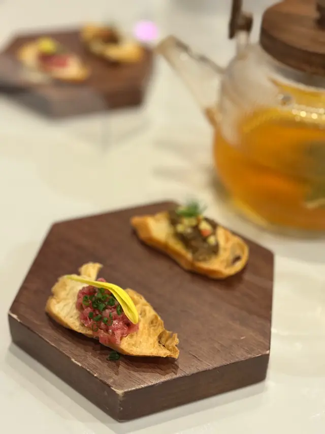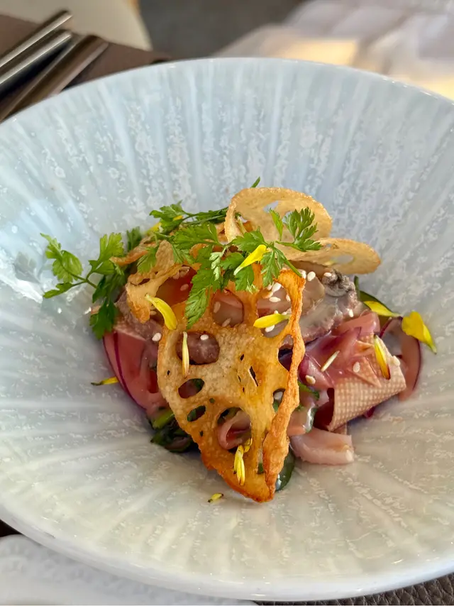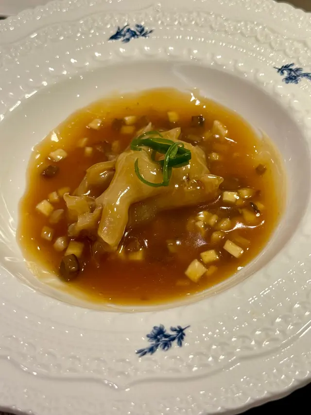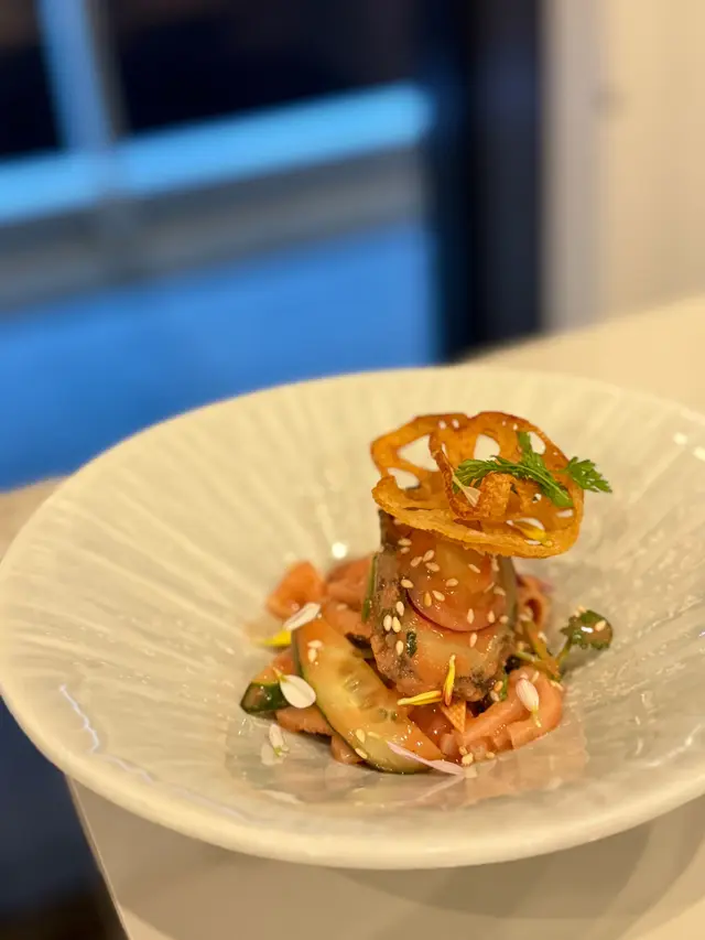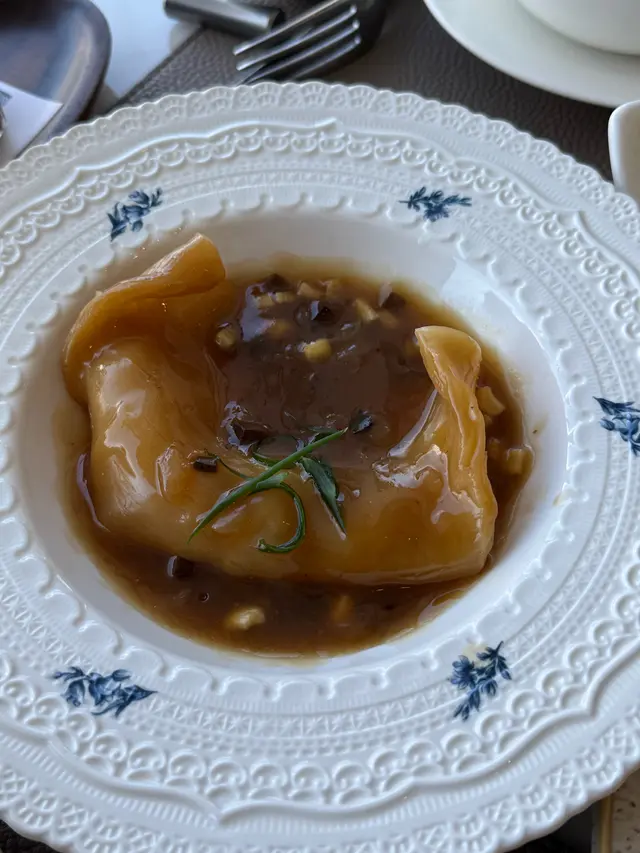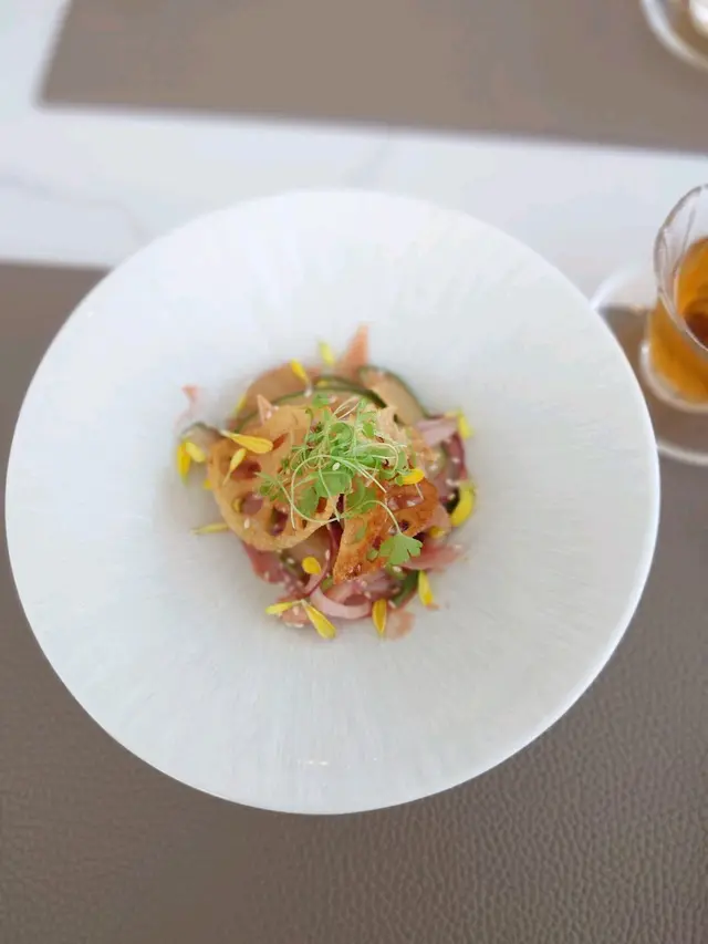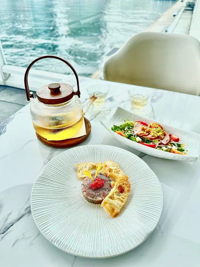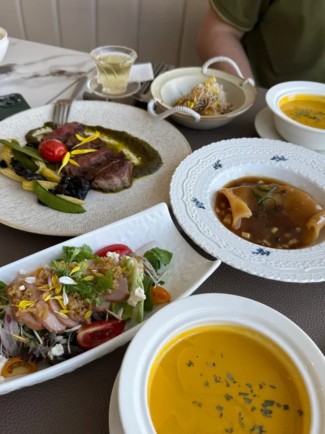 With the big typhoon coming to HK, everyone was rushing back home after work on this Monday evening. Going out for dinner before the signal no. 8 which would be hoisted later in midnight, we came to Mulan, in Harbour City, to try out their contemporary Chinese cuisine from their acclaimed female chef Ng Mung-Lam.Seated at a table on the window side, the harbour view at dusk was mind-blowing. The restaurant has a simple design, tidy and neat, offering customers a friendly and comfortable ambience. We ordered the Dinner Set ($838 each), which showcases Chef Ng’s approach of fusion cuisine incorporating Chinese ingredients and Western techniques.The starter is Tuna Tartare, with Caviar and Toast. The tuna is seasoned beautifully, with the French caviar adding a savoury taste to enhance the flavours. The toast on the side is also very crunchy, overall offering an impeccable start of the dinner.Next comes Yunnan Water Bamboo, Maitake, Truffle Tofu Sauce. Even though the water bamboo has a bit of bitterness, when combining with the maitake, and the truffle tofu sauce the flavours become more harmonized.The third course is Tempura Tiger Prawns with Salted Egg Yolk Sauce. The prawn is deep-fried with a thin batter in tempura style, paired with salted egg yolk sauce that is not too rich or heavy. The deep-fried shredded taro on top further adds to the enjoyment. For the soup, there are two choices. I go for Seasonal Vegetable Soup which is Mushroom Soup, with the blended mushroom offering rich flavours, the most Western-style of all dishes. My wife has the equally tasty Seasonal Dried Seafood Soup ($28 supplement), of more traditional style.The fifth course features Fish Maw in Two Styles. Prepared on the side, the fish maw has been used to make a corn soup together with conpoy, and also added in the scrambled egg to serve on the plate, with some truffle shaved on top. The flavours are good, but the dish is not hot enough in temperature.To transition to the main course, we are served Xinjiang Melon in Mint Syrup. An interesting small bite, the melon is not too sweet, with the refreshing taste of the mint helping to remove the flavours in the mouth to prepare for the next course.The seventh course is Roasted Golden Free-Range Chicken with Galanga Pesto, which is meant to share for two. The half chicken is beautifully roasted with golden colour skin, tender and juicy in flesh. The pesto is rich in taste, also there are also three different chili sauce on the side as condiment. The side dish includes sweet corn and French beans which are dusted with garlic salt.There are again a few choices for the eighth course, and I opted for Abalone and Sesame Sauce Flat Udon ($38 supplement). The udon has a pleasant al dente texture, with the sauce adding rich sesame flavours. The abalone is also nicely done and not rubbery. My wife has picked Yunnan Wild Mushroom Risotto which is also very good.For dessert, we both have chosen Mangosteen Sorbet with Yunnan Snow Swallow ($28 supplement). The sorbet is refreshing, not sweet but showing plenty of nice mangosteen taste. It is the first time I have tried dessert featuring this fruit. The snow swallow has a good bite to give contrast in texture. A delicate and nice one.Service is nice, but I hope the staff can give more introduction to the ingredients and dishes. The bill on the night is $2,088. A reasonable price, and consider the overall experience it is worth returning again, perhaps to pre-order the special menu which has some dishes I want to try.…查看更多