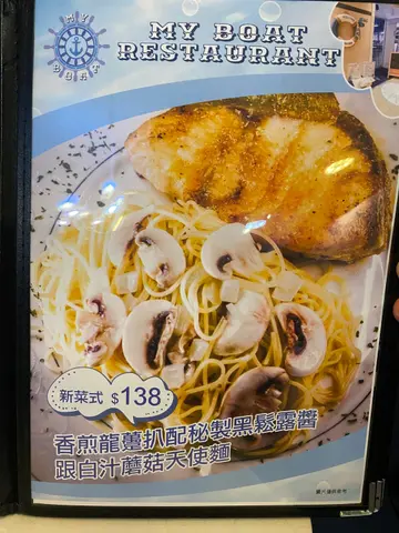 餐厅:My Boat (观塘)地址:观塘骏业街64号南益商业中心6楼C室最近观塘工厦嘅餐厅接连被打压,唉😮💨,唔知之后仲有冇机会喺工厦食饭呢?今次转战去到南益商业中心呢间My Boat @myboatrestaurant 食晚饭,佢哋开业五年,坚持用平民价钱打造最大可能嘅性价比高餐饮体验比客人💪,难怪吸引到一班长期客仔帮衬入到餐厅就被蓝白双色嘅设计吸引,唔讲以为自己去咗希腊嘅圣托里尼(Santorini)🇬🇷,话明喺My Boat⛴,装修设计都喺以船为版图,船舵、船锚⚓️、救生圈🛟、船模型🛥,真喺好有一种出船远征嘅感觉🥰,而且餐厅场地较大,座位之间都算阔落,仲有唔少卡位,就算喺度坐耐少少或者倾吓计都几舒服🤓晚市过嚟食饭有20几款套餐俾你拣,以粉面饭同扒类为主,仲送是日沙律🥗/餐汤同埋甜品一份,𠮶晚食饭嘅沙律喺薯仔蛋沙律,而汤就喺周打蚬汤。前者应该喺预先整定,似喺雪柜拎出嚟有少少冰冻🥶,不过蛋嘅份量都几多,加上蛋黄酱一齐食都算惹味;蚬汤鲜香足料,蚬肉份量唔少,亦唔会得死咸嘅味道👍✝️香辣西西里红酱美式肠长通粉 $63成兜满满嘅长通粉,用咗辣椒🌶️、蕃茄同洋葱等意式香料整成香辣西西里红酱,香辣得嚟充满酸香风味,非常开胃😋,面头有5片皮爽脆肉香味重嘅美式香肠,简而精,喺大众都会钟意嘅口味✝️香煎厚切肉眼扒跟意粉 $148超有惊喜嘅肉眼扒🎊,话明平民餐厅竟然可以食到比某啲高级西餐厅更出色嘅牛扒,仲要只喺$148就有呢个质素同份量,真喺完全估唔到😍。足3-4cm厚嘅肉眼扒,完美咁呈现出五成熟火候🔥,厚肉多汁嘅比例💦,加上香煎过外层轻轻焦脆内层软嫩嘅口感,虽然比较多筋同脂肪,不过块扒嘅份量就算切走啲筋同脂肪都好够两个人食😜,配埋餐厅秘制嘅牛肝菌汁,风味更加突出,比起原味就咁食又多上一层层次,值得推荐比大家一试😌跟餐加钱可以配小食,加$10要咗2只瑞士鸡翼,比我想像中大只得多,瑞士汁咸香入味而唔会太浓味;另外仲送热饮一杯☕️,冻饮或者特饮就要另外加钱,不过一个价钱送咁多嘢乜都值啦🤣