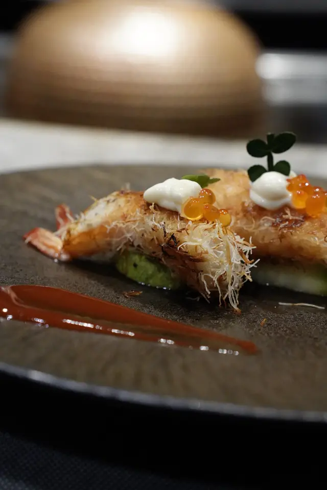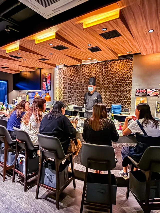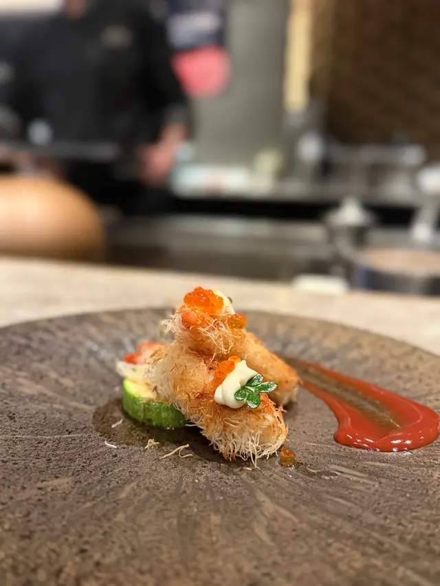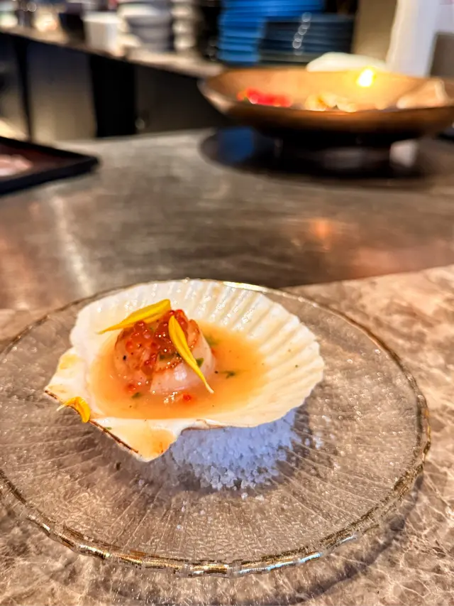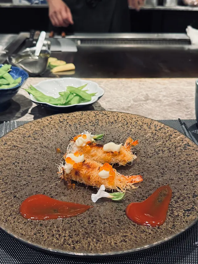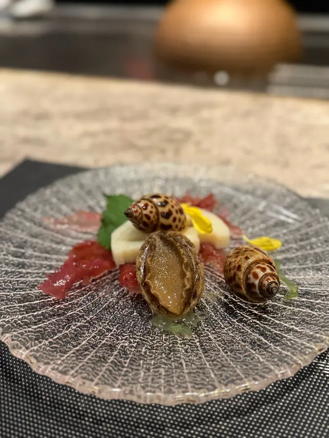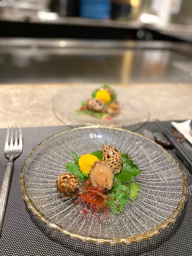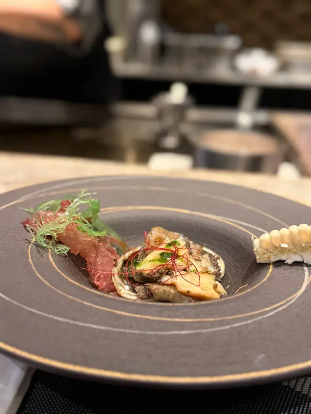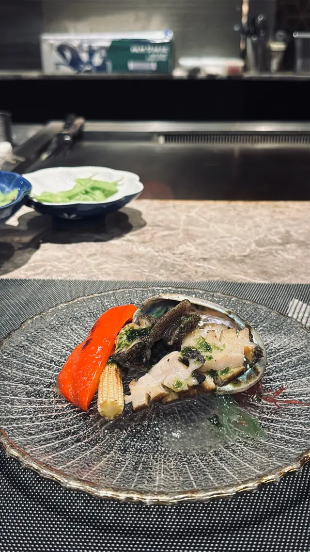 餐廳位於尖沙咀棉登徑地理位置優越設吧枱座位可以欣賞到師傅即席烹調精湛技藝氣氛好好當晚都滿座性價比高💗HK$690 per one前菜前菜都十分精緻!煙燻鮑魚增添香氣,口感彈牙。螺肉味道鮮甜。而蓮藕漬物爽口帶酸,令人開胃。 蟹肉蒸蛋茶碗蒸口感滑嫩綿密,每一啖都有滿滿既蟹肉絲,加左紅菜頭苗,味道清新。季節燒魚香魚係高級魚種,肉質細嫩鮮美,完全冇腥味,我幾鐘意個柚子醋,清爽開胃!見朋友食到勁乾淨,就知佢好滿意😂😂😂!日本白粟米第一次食,爽甜多汁。鐵板煎蝦卷脆米絲配雞尾酒醬薄薄脆米絲包裹著滿滿蝦肉餡料,煎到金黃酥脆。而cocktail sauce 係由蕃茄醬製成,再加上沖繩食用花點綴,層次口感相當豐富。鮑魚配海苔醬配蔬菜三點鮑魚口感彈牙,師傅以海苔醬調味,醬油鹹香,散發海苔香氣!另外,仲加左西班牙紅椒絲點綴,增添香氣同微辣口感,幾過癮!鵝肝多士鵝肝口感細緻綿密,入口即化🥹,油份沾上脆卜卜多士,好味到呢!沾上山梅醬,酸酸甜甜有助降低油膩感,最後食埋菠蘿,超甜超多汁!沙律沙律菜好新鮮,同時可以清一清味蕾。🫎鐵板壽喜燒A5和牛薄燒和牛以霜降油花分佈均勻、入口即化,壽喜燒醬汁香醇,甜度恰到好處,呢個配搭令牛肉更加柔軟細膩🤤。鐵板炒飯鐵板炒飯飯粒分明,口感較為乾爽,不黏糊之餘仲要夠鑊氣!睇住師傅加入蛋醬、香蔥等炒成,啖啖都充滿蛋香,十分療癒!湯魚湯味道清甜,一定要趁熱飲!甜品甜品係雪糕,分別係荔枝同埋紅豆味。兩款都唔太甜,香氣撲鼻,滿足😬。Read More