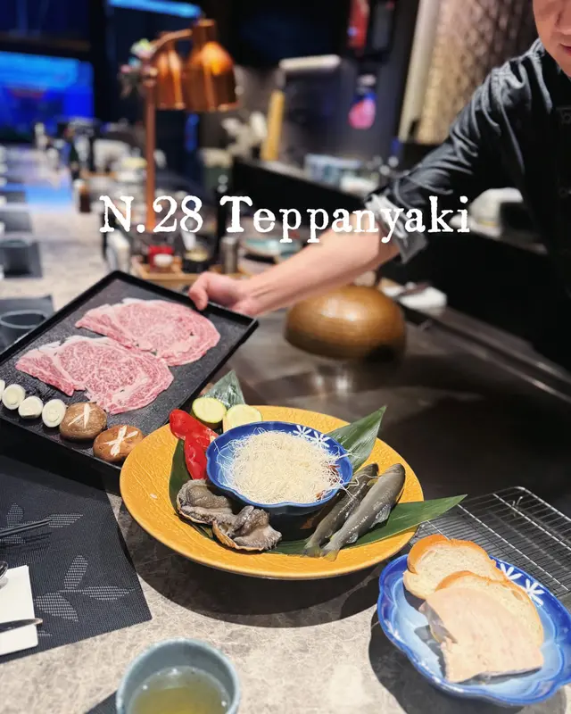 N.28 Teppanyaki 鐵板燒,廚師席前烹飪,與客人互動,客人能欣賞到廚師的技藝和食材的鮮美,增添用餐趣味。烹飪過程中,香氣彌漫,讓人期待美食的到來。裝潢結合日式元素、和式屏風及木質家具,營造優雅感覺。今次選了 <精選優惠套餐 $790> 及<廚師發辦套餐 $690>,各有十道菜式,除了不同的主菜,前菜、炒飯及吸物也一樣,可以同朋友互相分享。前菜前菜拼盤精緻,梅貝肉質彈牙,淡淡煙燻香氣,口感滑嫩,鮮味可口。磯煮鮑魚以醬汁加海苔慢火炆煮,入口鮮甜、帶嚼勁,令人回味。醃漬蓮藕爽脆口,伴隨酸甜的醃漬味,開胃十足。特色鐵板蒸蛋茶蛋香滑柔嫩,濃滑蛋香,加上一絲絲的蟹肉,鮮香融入蒸蛋中,令人溫暖。 <3款主菜- 精選優惠套餐>鐵板大蝦配蝦膏醬大蝦表面焦脆,肉質爽彈,傳來陣陣鮮香。蝦頭充滿金黃蝦膏,可一啖品嚐惹味蝦膏、彈牙蝦肉,雙重享受。 日本帆立貝配魚籽帆立貝厚身,煎至表面金黃,口感滑溜、濕潤,搭配魚籽的鹹香,瞬間帶來海洋風味。·香煎比目魚配雞尾酒醬比目魚外表焦香,魚皮入口吱嚓聲,清脆鮮香,魚油滿滿,沾上酸甜的雞尾酒汁,令人食指大動。<3款主菜- 廚師發辦套餐>南非鮑魚配海苔醬鮮活的南非鮑魚,仍在鐵板上生猛郁動。厚實的鮑魚,鮮香撲鼻,伴以海苔汁的獨特風味,味道甘甜,令人大快朵頤!燒香魚香魚是時令漁獲,放在爐端上煎香,魚皮酥脆,魚肉嫰滑肥厚,加上酸汁提鮮,鮮香細膩。天使麵蝦卷酥脆的天使麵,包裹著鮮美大蝦,搭配三文魚籽及沙律醬,口感豐富,香脆滋味。鵝肝配和歌山莓醬擺碟精緻,豐腴的鵝肝,肉質油潤綿密,咬下去濃郁脂香,沾上莓醬,酸甜解膩。 再吃一口燒菠蘿,香甜多汁,清新味覺。A5宮崎和牛薄燒 或 壽喜燒和牛和牛油脂均勻,燒至五成熟,肉質軟滑嫰紅,肉汁在口中散發。內裡蔥花,迷人牛香,跟配岩鹽、昆布鹽,炸蒜片,更添滋味。和牛軟嫩多汁,掛上濃稠的壽喜燒汁,美味香甜,質感順滑。田園沙律新鮮的沙律菜,與清爽的胡麻醬汁,口感清新,味道清爽平衡。 ·特色炒飯 + 季節魚湯炒飯的香氣四溢,炒至粒粒乾爽,加入牛肉、香蔥、雞蛋快炒,香蔥爆香後更惹味,感覺䁔笠笠。魚湯奶香清甜,魚香伴隨著昆布的鮮美,熱熱下肚很暖胃。荔枝雪糕洋溢天然荔枝香氣,冰涼舒暢的感覺,劃上完美的句號。Read More