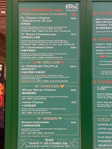 N+ BURGER 制作全天然安格斯牛肉配酸种面包汉堡。N+ BURGER的牛肉来自于位于新南威尔士州的五个牧场,拥有130,000公顷的原始牧草地,饲养的安格斯黑牛不含任何生长激素(HGP),同时具清真认证,为顾客提供更健康、安全的用餐选择。