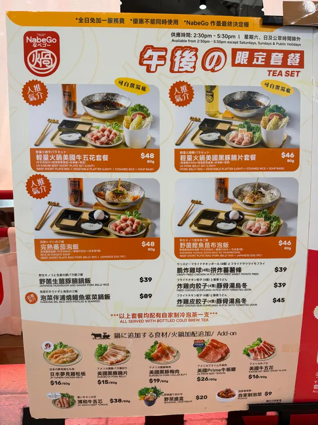 NabeGo (荃湾) 网上订位即赚Rice Dollars 网址: https://s.openrice.com/QrLS0jw8D00 地址: 香港荃灣楊屋道1號荃新天地UG樓UG78號舖 电话: +852 35472338