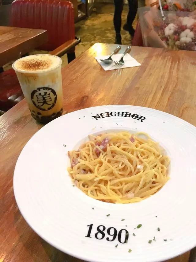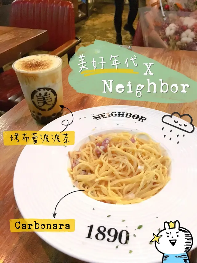 想試美好年代好耐,不過好可惜香港無佢最出名既珍珠奶茶班戟😢。不過點都要會一會佢地既烤布蕾波波茶🤤!-美好年代選址喺銅鑼灣一個安靜既轉角位,不過都算易搵。黎之前我睇左openrice好耐,因為我見同一個地址有兩間餐廳,仲以為自己搞錯😛,原來真係同一個地址,不過美好年代就主力係地下做外賣,而佢既野飲就會供應埋比樓上既Neighbor。呢個合作方法都幾好,可以一次過試哂兩個餐廳😝!-因為要避雨,所以今次可以上去坐下試埋Neighbor。不過佢既裝修風格係走工業風👷🏻,燈光比較陰沉,條樓梯同無燈無咩分別😂,行個陣要小心啲。Neighbor係一間西式餐廳,有意粉/Risotto/PIZZA/Burger/Main Course食,睇落都幾吸引,而且價錢都唔算好貴🤙🏻。-不過我只係黎避個雨,所以就普普通通叫左個Lunch Set。Lunch Set 由$48-$118不等,意粉/Risotto/Burger/Steak 每樣都有兩三款比你揀,幾多選擇,燒春雞同肉眼扒都只係$68同$118,以銅鑼灣食Lunch黎講都算平✨👏🏻!-Carbonara $48份量唔算太多,平時會食剩既我都清得哂🍝,Carbonara味唔濃,要靠洋蔥同煙肉吊味😶,奇怪既係我食到有少少酸味,唔知係忌廉定芝士邊一邊出事☹️,雖然so far都無肚痛,但對呢碟Carbonara都幾失望。-烤布蕾波波茶 $29成個Lunch最滿意呢杯烤布蕾波波茶😌,上面既焦糖燒得好香,即使搞云左都仲飲到濃濃既焦香味😍。奶蓋香濃,好重芝士味,質感杰杰地,好食😘!黑糖味濃郁,好香奶味,黑糖珍珠煙韌彈牙,邊咬邊滲啲黑糖出黎,正!-雖然個日落大雨,餐廳無乜人唔算好忙,但侍應普遍都有啲呆滯😅,有時係佢面前招手都睇唔到,有時仲坐左喺卡位道休息添🙂,員工攰,想休息其實我都理解接受到,但我覺得至少要係客人睇唔到既情況之下🙈。查看更多