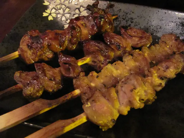 四串有關雞的串燒,分別是雞肝、雞心、雞皮及雞腎
