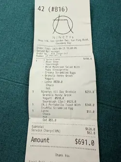 Ninety’s in Wan Chai was my goto coffee when I used to work there, I really enjoyed their nutty flavoured beans. So came to Lee Gardens for their brunch, we enjoyed the space and the deco, it was much more spacious than many other cafes. I enjoyed their simple brunch set with all day breakfast, scramble egg on sour dough. The all day breakfast had a nice croffle, and a good mix of fluffy eggs, mushrooms, nicely dressed kale, and their own charsiu. There’s also a lot of sides to add, we ended up adding two sour dough (which I absolutely loved, and yogurt). The portobello toast with truffle scrambled eggs also simple and nice. The choose your own brunch board can be a bit of a miss, the miso soup (although was a choice) was not really a match with the others, its hard to say what goes with what until you see it infront of you. Service can be better, overall was a decent brunch choice in the area! 查看更多