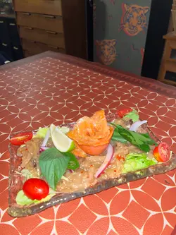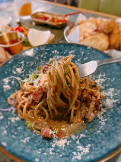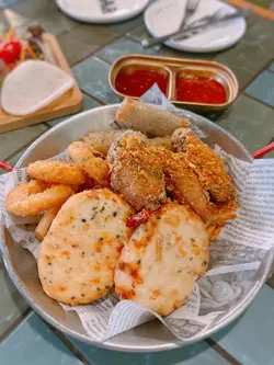 幾年前食過呢間餐廳食物質素唔錯😋無論裝修及菜式名都充滿趣味🤪環境設計好特別佈置又有心思❤️餐廳主打西式料理🍽️掃𝙌𝙍 𝙘𝙤𝙙𝙚自助下單📱方便快捷不過用餐時間只有90分鐘要注意二人晚市套餐 $588是日餐湯(2碗)🍄🟫🥣今日的湯是忌廉蘑菇湯,飲到好濃郁菇菌味,口感較為稀身,而我個人比較中意飲濃稠的質感,覺得會較實在啲😂小食豆腐魚餅(2件)🧆2件豆腐魚餅外型好似薯餅,表面炸到金黃香脆,魚餅內餡仲有粟米粒🌽、紅蘿蔔粒🥕,咬落去口感唔會太淋,配上泰式醬汁更滋味主菜辣椒螃蟹醬蟹肉蟹籽意粉🦀🍝意粉鋪滿蟹肉,蟹籽,車厘茄🍅,雜菌🍄🟫,加入辣椒螃蟹醬及番茄醬混合調味,意粉口感煙韌彈牙,每條意粉都掛滿醬汁,濃烈的酸甜香辣有啲似泰式辣醬🌶️,越食越過癮惹味十足😋羅望子醬燒美國豬肋骨配薯條🐷🍟燒豬肋骨🐷厚肉好大條,啖啖肉肉質軟嫩,咬落去肉好易離骨,沾滿羅望子醬汁超入味,配上香脆的炸薯條🍟及沙律菜🥗飲品桂花柑桔蘋果沙冰🍎🍹 +$28加$28轉特飲,有3片薄切蘋果片🍎做點綴,飲到清香的桂花味及蘋果味,隱約有微微柑桔味,沙冰口感冰爽,好岩夏天飲非常消暑解渴蜂蜜水蜜桃茶(凍)🍑🍹飲到香濃水蜜桃味,底部有少量蜜桃粒有咬口是日心情甜品🍰甜品是兩件細細件開心果巴斯克蛋糕,微微焦香及淡淡的開心果味好夾冬陰功大蝦薄比薩(辣)🦐🍕𝙋𝙞𝙯𝙯𝙖🍕餅底薄身,切好分成6件,每件𝙋𝙞𝙯𝙯𝙖都有大大隻鮮蝦🦐爽口彈牙,香甜菠蘿🍍,冬陰功薯蓉,青尖椒🫑及紫洋蔥🧅,配上芝士🧀食落幾有泰國風味,同朋友一齊分享好滿足🥰…查看更多