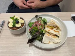 早几日见到有youtuber推介呢间coffee shop既沙律碗,见到佢影出黎既实物都几吸引,咁岩呢排有D迷恋健康餐,今日就捉左个朋友去试下!⭐墨西哥鸡肉饀饼原本朋友叫左走芝士,但QR落完单店员专登行过黎同我地讲走唔到(我地先知原来佢呢款野食都系一早整好/入货reheat返🫣)馅饼里面既鸡肉唔鞋口,饼皮微暖,味道普普通通呢个餐仲跟左个迷你希腊式yogurt,上面有啲nuts同🍌🫐⭐牛柳沙律碗(七成熟)牛柳偏厚身,外层煎得几香,里面keep到粉嫩配料水准正常(都系切出黎架姐😂)两个餐都唔包饮品,要加$28起,另收加一,埋单$293,个人样认为性价比还好⋯⋯