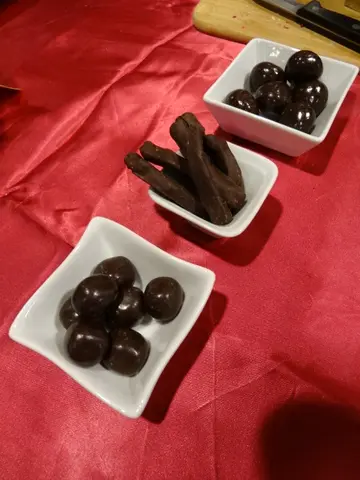 配上比利时白朱古力或纯黑朱古力皆宜;前者比后者甜一点!此外,另有其他脱水鲜果朱古力可供选择,包括:红桑莓、黑加伦子、车厘子及蓝莓。我对坊间少见的脱水车厘子朱古力最感兴趣!