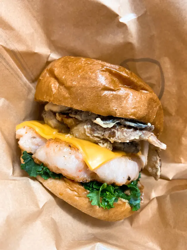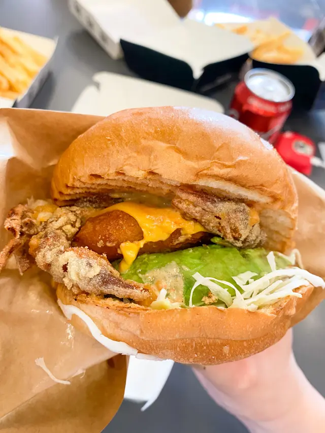 係紅磡有間專門做漢堡外賣嘅餐廳🍔每次落完單都要等一段時間轉個頭先返黎攞外賣🤣 因為真係好多人食🤩而好鐘意食軟殼蟹嘅我 當然要試下有軟殼蟹🦀做餡料嘅漢堡🍔軟殼蟹蝦餅蟹皇醬漢堡材料好足🥰大大隻軟殼蟹🦀 仲大過個漢堡包少少🫣咬落口好香好脆😍 而且味道好濃好新鮮😋蝦餅🦐 又係一大塊 好厚肉☺️香脆可口 炸得好好👍🏽再配埋牛油果係底🥑 一脆一軟 形成左特別嘅口感🤩而且牛油果 令到咬落去炸物嘅時候冇咁油膩食落肚都冇咁易濟😉另外仲有啲芝士🧀 同埋椰菜絲所以一大啖咬落漢堡嘅時候 有好多層次感🥰查看更多