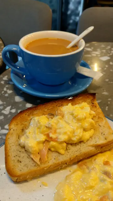 意式咖啡意式咖啡比较港式奶茶更抵饮,反正冷热饮唔使加钱,又唔使加一,不过不失!烟三文鱼配炒蛋及多士因为我唔受得生嘢,落单前,我问清楚老板,炒蛋是否连烟三文鱼一齐炒?!他回答是!店方的炒蛋比预期水嫩又大份,