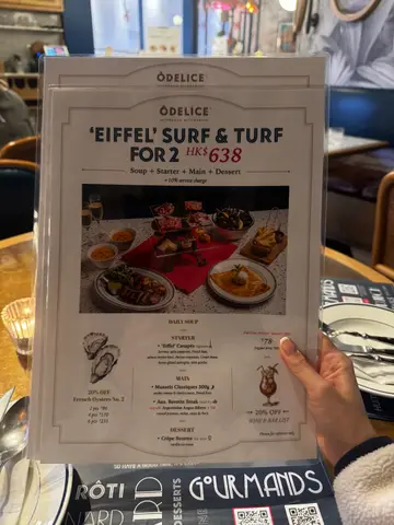 Odelice典雅的装潢,店面的深蓝色主调,设计融合法式风情,搭配法国风格的挂画,营造雅致时尚氛围。大窗户让自然光透入,增添开放感。精致的法式点心,摆放在巴黎铁塔上,色彩鲜艳,增添浪漫的情调,如置身于巴黎的小餐馆,适合情侣约会。头盘: 巴黎前奏风干火腿入口油润,肉质浓郁鲜美,带微微咸香。法式火腿口感细腻,散发淡淡的烟熏香。炸三文鱼球外层酥脆,内里鲜香的鱼肉,满满的奶香,一口接一口。烟三文鱼风味独特,搭配面包更美味。迷你蛋批软绵,蛋香吸引,是开胃小点心。吞拿鱼挞挞皮酥脆,填满鲜嫩的吞拿鱼蓉,十分惹味。甘荀餐汤配法包热烫的甘荀汤,浓稠香甜,散发清甜的甘荀香,把香脆法包沾上热汤,令人暖笠笠。主菜法式煮青口青口细嫰,质感挺身,完全浸泡在牛油香草汁,咀嚼时散发牛油香气,鲜香细滑,加上洋葱的点缀,鲜味十足。粗身薯条,香脆可口,食指大动。澳洲牛胸腹扒五成熟的牛胸腹扒,肉质粉嫰、软腍,肉汁丰沛,沾上巴黎牛油汁,醇厚的牛油香气,提升风味。纯厚肉香迷人。跟配烧薯粒,表面略微焦脆,增添浓郁口感。甜品火焰橙酒可丽饼可丽饼薄而柔软,口感顺滑,火焰效果令人惊艳,亦增强橙酒的香味,雪糕慢慢溶化,淡淡云喱嗱味道,使味道更丰富。…查看更多