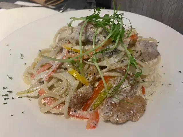 和富中心呢間cafe, Lunch Menu幾吸引,任揀配料醬汁嘅意粉,可以任飲餐湯.沙律。揀咗黑松露忌廉汁,配海鮮.蟹肉意粉,賣相好精緻。大大隻青口.鮮蝦爽口新鮮.仲有蟹棒.蜆肉.帶子,無諗過幾十蚊可以食到咁足料嘅午餐😍+$18 配草莓奶昔好Creamy, 打得夠滑唔會成口冰。+$15柚子芝士蛋糕見到隔離枱食熱辣辣嘅石燒牛,塊牛厚切好有份量,下次再嚟一定要試😍真心讚👍🏻👍🏻👍🏻好食又抵食查看更多