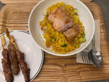 I ordered the set of Grilled chicken thigh, with Japanese Aomori rice in fresh tomato soup. I also had the Qoo apple juice for drinks and a cumin sausage skewer as snacks. The portion is bigger than I expected. And it tasted quite good actually. The chicken is juicy and tender, with its skin roasted to golden brown and slightly crispy texture. The Japanese Aomori rice is also a perfect match with the tomato soup. They have added some parsley at the top as garnish so it looks good as well. The sweet and sour taste of tomato soup will ease the meaty flavour from the chicken. And the Japanese rice will make your stomach fulfilled. I added the cumin sausage skewer to the combo and makes the whole meal more interesting and remarkable.…查看更多