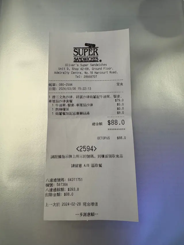Oliver's Super Sandwiches (海富中心) (金钟) 网址: https://s.openrice.com/QrLS0ocS000 地址: 香港金鐘夏慤道18號海富中心地下42-68號舖D單位 电话: +852 28668707