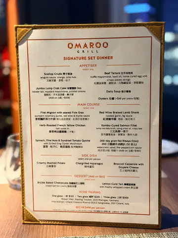 中环高楼景观扒房 浪漫氛围十足约会/庆祝一流❣️ 上一层仲有天台酒吧晚市套餐 𝐒𝐈𝐆𝐍𝐀𝐓𝐔𝐑𝐄 𝐒𝐄𝐓 𝐃𝐈𝐍𝐍𝐄𝐑 ($498) 头盘+主菜+配菜𝙖𝙥𝙥𝙚𝙩𝙞𝙨𝙚𝙧❛ Tuna tataki 炙烧吞拿鱼❛ Veal with tuna sauce 吞拿鱼酱小牛肉❛ Jumbo Lump Crab Cake 珍宝蟹饼 (+$108)外脆内嫩 啖啖鲜甜蟹肉 唔系好大份𝙢𝙖𝙞𝙣 𝙘𝙤𝙪𝙧𝙨𝙚❛ Duo Steak 牛柳双重奏一边配鹅肝 另一边配蟹肉好诱人牛柳肉质软腍 熟度恰好 ❛ Lamb Wellington 羊肉威灵顿羊肉威灵顿第一次食到!脆酥皮唔会太厚羊柳香嫩 要趁热享用❛ Iberico Pork Chop 伊比利亚猪扒用面包糠 迷迭香同大蒜包住 香脆可口里面猪扒肉质保持嫩滑❛ Pressed Chicken 酥脆香煎鸡外皮酥脆 肉质软腍 配鸭肝慕丝几惹味𝙙𝙚𝙨𝙨𝙚𝙧𝙩❛ Mango and Passion Fruit Soufflé ($180)梳乎厘好轻盈 阵阵蛋香混入芒果粒同百香果籽味道微酸清新 唔会太甜 run by Wooloomoolooo Group, @omaroogrill is a romantic steakhouse located on the 26/F with an amazing view. their set dinner includes an appetiser, main course & side dish. first time trying 𝘓𝘢𝘮𝘣 𝘞𝘦𝘭𝘭𝘪𝘯𝘨𝘵𝘰𝘯 – crispy pastry as it is just served, inside was tender & flavourful. 𝘋𝘶𝘰 𝘚𝘵𝘦𝘢𝘬 features juicy tenderloin, foie gras & crabmeat, satisfying both seafood & meat lovers. the 𝘔𝘢𝘯𝘨𝘰 𝘢𝘯𝘥 𝘗𝘢𝘴𝘴𝘪𝘰𝘯 𝘍𝘳𝘶𝘪𝘵 𝘚𝘰𝘶𝘧𝘧𝘭𝘦́ was fluffy & perfect balance between sour & sweetness. overall great spot for celebrations or dates!—ʜᴋᴅ $500 𝗉𝗉 (dinner)𝙧𝙚𝙨𝙚𝙧𝙫𝙖𝙩𝙞𝙤𝙣𝙨: yes𝙧𝙚𝙫𝙞𝙨𝙞𝙩? maybe𝙤𝙫𝙚𝙧𝙖𝙡𝙡: 7.5/10—📍 OMAROO GRILL 中环皇后大道中80号H Queen‘s 26楼26/F, H Queen’s, 80 Queen’s Road Central Central…查看更多