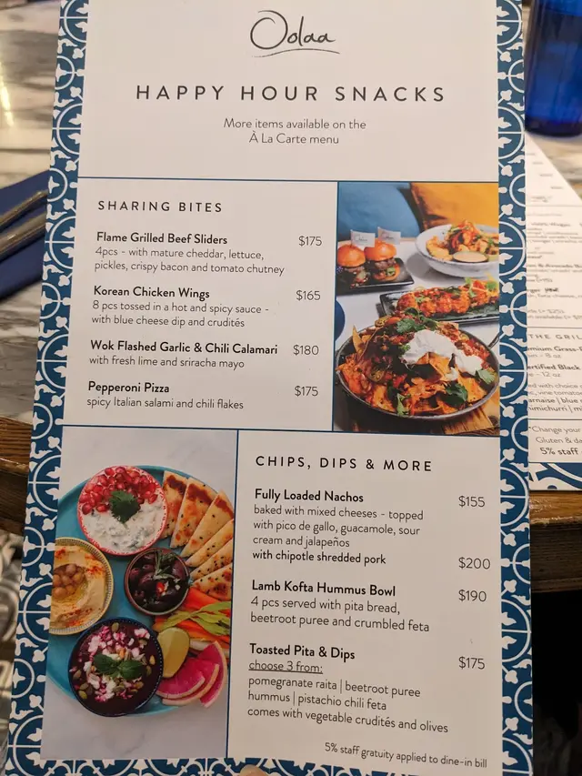 今日同朋友一齊來食西餐,一出地鐵行去對面商場就見到,入到食肆後才發現地方不錯,感覺舒服,有happy hour,看來是搵對地方頓時心情不錯!餐廳提供多國菜,happy hour 小食幾吸引,今晚食晚餐,下次約多幾位朋友過來可以點多些小食!今次先點喜歡的飲品及菜式,有點期待!Very Berry $90果汁包含覆盆子、草莓、藍莓、蘋果汁及蜜糖。入口感覺良好,果肉微粒及果香俱全,甜度舒適,一次過飲到幾款有營水果確實不錯,清爽及甜美。Hot Chocolate - Large $50熱朱古力選大杯,估不到有一塊曲奇跟熱朱古力,曲奇鬆化,熱朱古力也濃厚,甜度舒適,意外好飲,是一杯品質較突出的熱朱古力。美中不足是曲奇缺了一角,可能是太鬆化了!Pan-Fried Sea Bass, Nduja butter sauce, crusted basil crumbs, roast potatoes and tomato basil concasse $230賣相真美,海鱸魚魚皮焦香,魚皮帶點麵包糠; 青檸、蕃茄、薯塊及Nduja butter醬汁加起來令顏色豐富兼食欲大增。海鱸魚肉質軟腍,焦香魚皮有調味,連魚肉一齊食好好味。薯塊同樣軟腍,Nduja butter是一種意大利醬汁,順滑有少少甜味,幾特別,好鍾意!Pistachio & Herb Crusted Lamb Fillet, On cauliflower puree – with ratatouille, au jus and fresh mint sauce $245擺盤與別不同,炸蓮藕又薄又脆,羊扒上有脆口麵包糠及薄荷醬,底部是白色椰菜花泥及長豆角。羊扒熟度剛好軟腍又有咬口,加上椰菜花泥口感豐富,好味好滿意!Cobb Salad – Flame Grilled Beef $200這份沙律可以選牛、雞或三文魚。一見到牛肉的份量有點意外,是一份已切好有燒烤紋的牛扒,生熟度不錯而且入味。沙律材料富豐,有牛油果、蛋、青瓜、紫洋蔥、生菜、煙肉、麵包糠、藍紋芝士及蕃茄等,抵食!Oolaa’s Char-Grilled Burger – 100% Wagyu $190和牛漢堡選牛油果醬及是拉差蛋黃醬,一看就很吸引,份量足,薯條又長又夠厚調味足,可以加點少辣的是拉差蛋黃醬味道更豐富。是拉差蛋黃醬也可以加入和牛漢堡,和牛漢堡蔬菜新鮮,牛油果醬加添濕度,和牛肉汁多軟腍好食!侍應友善,會詢問我們對於食物的意見,每份菜式色香味俱全,份量很合適。餐牌簡潔,主流菜式、素菜、飲品及酒類都應有盡有,連和牛漢堡的配料及醬汁都有幾款選擇,無可挑剔!…查看更多