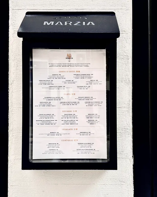 Osteria Marzia (湾仔) 网上订位享特别优惠并赚Rice Dollars 网址: https://s.openrice.com/QrLS0nbK800 地址: 香港灣仔菲林明道41號芬名酒店地舖 电话: +852 36072253