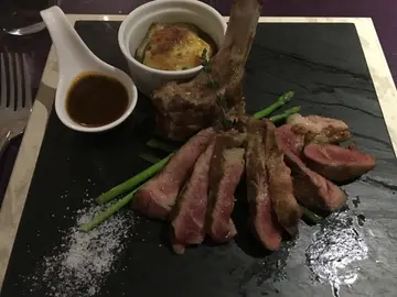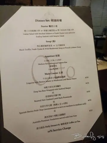 这间餐厅有2层, 由1条楼梯连接, 我哋获安排坐在一角, 我们是今晚第一台客人, 望出去是商厦, 所以冇咩好睇, 室内环境比较暗, 情调不错.首先送上面包, D面包好松软, 唔错!烟3文鱼, 好好味! 意大利巴马火腿也好好食! 黑鱼子蟹肉沙津好...腥!薄切生带子配上温室豆苗, 味觉清新.蘑菇汤好好饮! 蘑菇味浓! 一定要试!精选海鲜拼盘D带子细得出奇, 味道一般! 只大虾鲜甜弹牙! 只龙虾虽然鲜甜但份量略嫌太少! 白酒煮蚬, 蚬肉鲜甜入味!安格斯肉眼扒, 肉质嫩, 牛肉味重! 相当好味!意大利芝士饼酒味略重, 甜度适中, 口感相当滑!暖朱古力布甸配雪糕甜度适中, 会流心! 但云呢拿雪糕虽然好滑但味道略淡.Read More