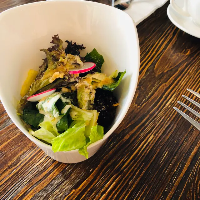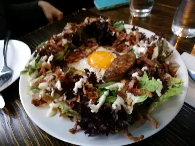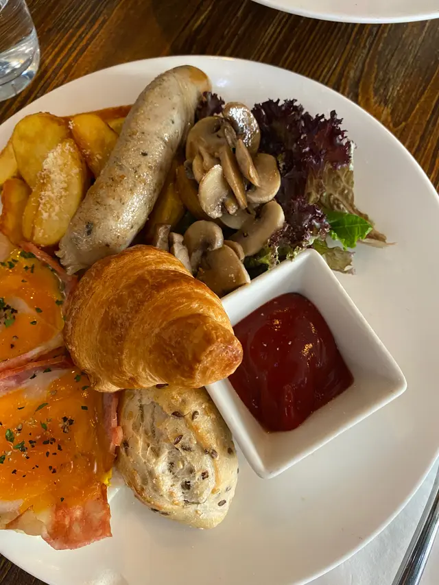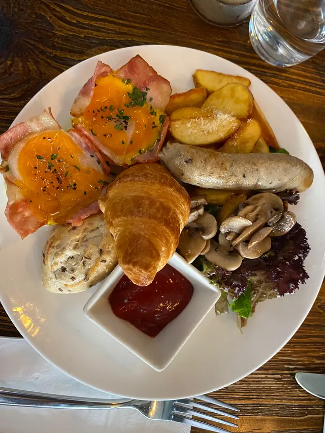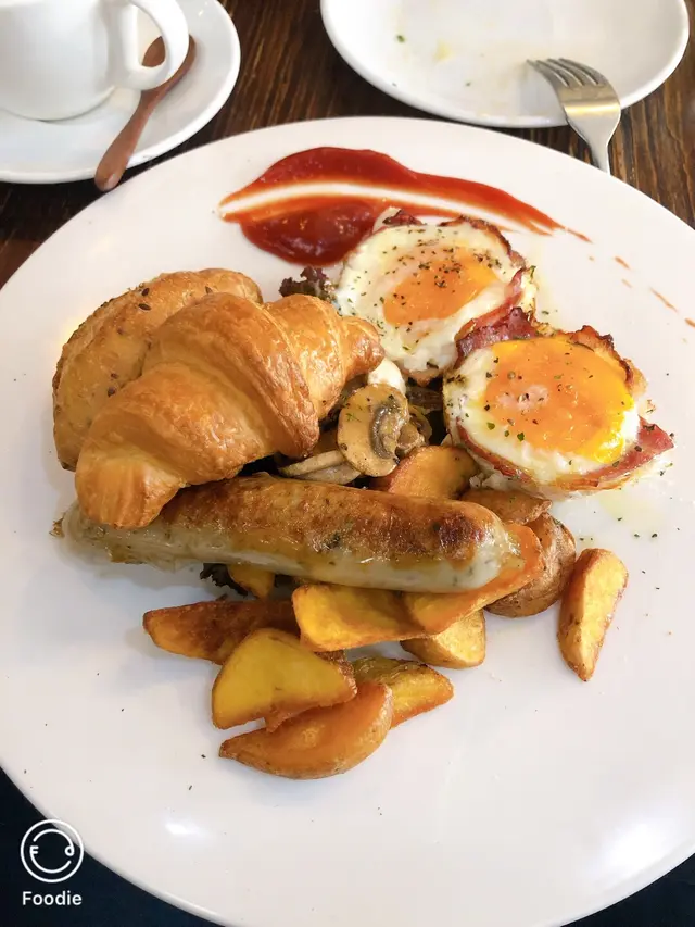 這為小店,今次為了all day breakfast 才找上這間餐廳。一入門口暗暗的,但環境尚算寬躺。今次主食All day breakfast : 蛋是焗的,蛋黃仍是有少許流心狀態是最好的,驚喜點是它夾埋煙肉一齊焗,而且煙肉沒有太乾身,可以看到廚師用心整理,第一次食這個做法,它本身是法國餐廳不知是否法式做法😋。另外廚師用了有香濃菇味的菇菌類(因為食過有餐廳只係用平價菇而沒有菇味的)這點可以加分。新鮮薯仔亦很好味。另外佢用兩款唔同嘅包取代普通用的方麵包,包也是很鬆軟。整體可以看出廚師用心整這道菜式。見到他有咖啡機,便點了一杯泡沫咖啡,合格,如果佢有啲更出色嘅咖啡就一流。…查看更多