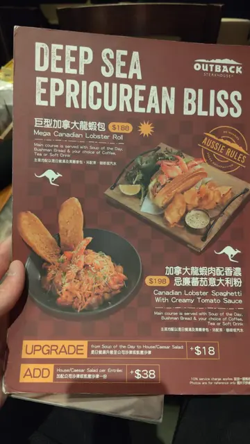 以澳洲内陆为灵感的Outback主打特色牛扒,烹调不同的牛扒种类,并均由澳洲空运到港,连餐厅布置也充满澳洲色彩。