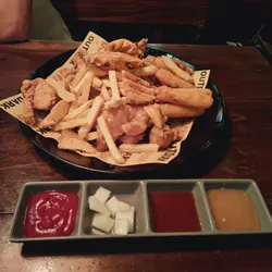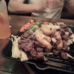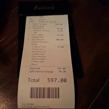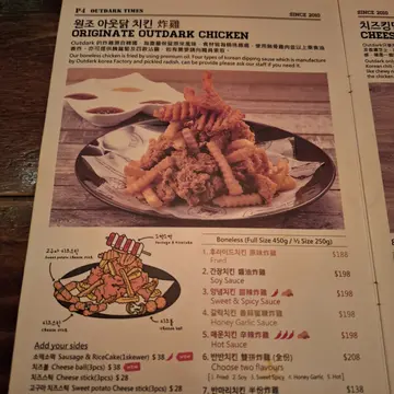 同班friend去旺角Outdark食晚餐,一入门口已经好惊喜!有部免费即影即有黑白相机,我哋即刻疯狂自拍,留念一流!餐厅环境暗暗哋,挂满星星灯同铁桶枱,气氛舒服又温馨,劲多情侣同家庭客,倾计啱晒。▪️牛油韩式烤牛肉 (Butter Flavored Beef Bulgogi):一上枱闻到牛油香到晕!牛肉腌得够甜,用铁板上热辣辣,配埋金菇、韩式年糕一齐食,好惹味!听讲系正宗韩国人煮,味道果然唔同啲!▪️双拼韩式炸鸡 (原味+蜜糖蒜):炸鸡即叫即炸,皮脆肉嫩仲有肉汁!原味已经好得,蜜糖蒜味香甜唔漏,份量巨大,够3-4人分享。▪️芝士条/地瓜芝士条:拉丝拉到半米高!地瓜味香甜软糯,好有惊喜。▪️GRAPEFRUIT (Add Soju):西柚味清新,沟埋烧酒好易入口,朋友话不知不觉饮多咗!▪️HOT PEACH LEMON TEA:蜜桃味香,饮完成个人暖笠笠,唔会太甜,唔错。▪️芝士条好食,但食多两条会觉得有啲滞,最好多人分享。总结:呢度食物大份又好味,环境同服务都好贴心,绝对系同闺蜜或者屋企人嚟Hea嘅好地方!会再encore!…查看更多