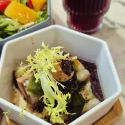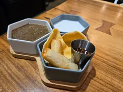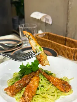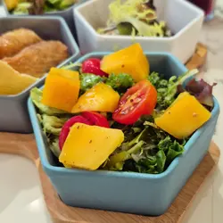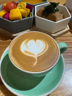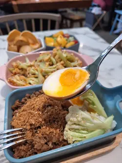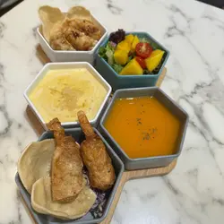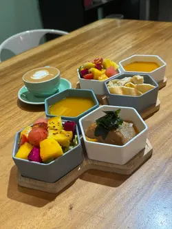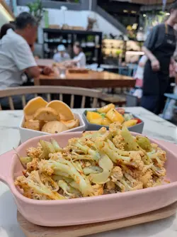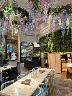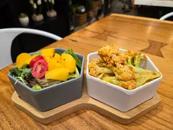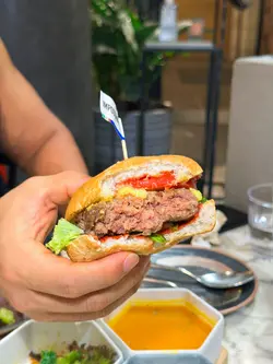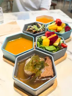 今次來到灣仔一間主打健康打卡的素食Cafe小店,店舖擺放了各種盆景植物,入到店時有心情開朗、心曠神怡的感覺,彷彿置身都市中的小森林。🌳🪴💚👭晚上的主食套餐會跟沙律、餐湯、餐飲及一份小食,擺盤精緻,同時沙律選了芒果、菠蘿、紅色火龍果和沙律菜,組合到色彩繽紛,進食時也會胃口大增。🥗🍲🥟🍹✨ 黑椒天貝漢堡($178),以發酵大豆製成的「天貝」為主角,口感紮實有嚼勁,煎至外香內軟,加入濃郁黑椒醬提味。口感也有點像炸芋頭的味道,鹹香過癮,初嘗這款天貝漢堡幾有驚喜的味道體驗。🍔🌿✨ 香草南瓜意大利飯配鹽酥雞($178),南瓜泥融入在意大利飯當中,色澤金黃、口感綿密creamy。幾有亮點的是素食鹽酥雞,外皮炸得外酥內嫩,咬下有雞肉般的纖維感,幾有驚喜。🎃🍗✨ 朱古力香蕉西多士配雲呢拿雪糕($68),一片片磚塊形狀的西多士淋上了朱古力醬,在加入了新鮮香蕉和簡單的雲呢拿雪糕,冷熱交融,為這頓健康晚餐作出了完美作結。🍫🥠🍨…查看更多