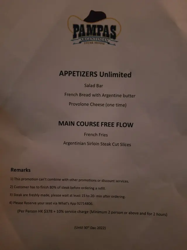 For the price of $378, you can enjoy their unlimited steak offer.The salad bar is also unlimited but of course I wanted to save my appetite for their steak.Their provolone cheese was amazing with their bread. Luckily, it was only served once or I would have had seconds and it would have ruined my appetite for the steak.Argentine steak has a less fat content, giving it a more firm texture even if medium or medium rare. However, since it has less fat, actually it allows you to eat more. I ended up having 6, which were all quite good though occasionally they forgot to my refill order but it is quite understandable as their restaurant was almost full by 645pm. Therefore, reserve in advance.…查看更多