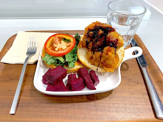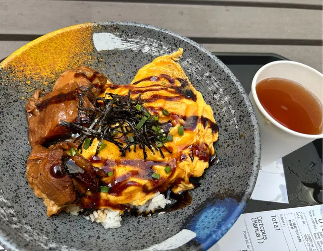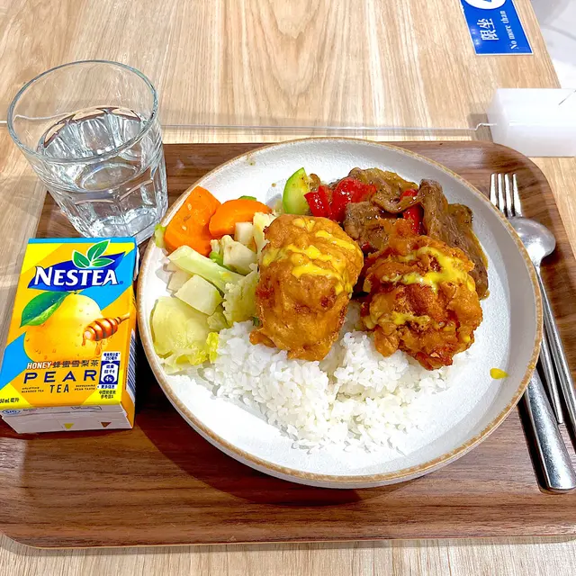 Rice with vegan chicken and stewed beef ribs with miso tomato