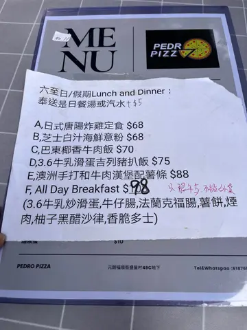 Pedro pizza香港闷闷雨多日终于有个好天气的周末疫情之下,都没有晚市堂食唯有中午出黎走一走想入元郎食野但系又太多人太塞车经友人推介知道元朗既村屋深处新开左一间小小餐厅主打pizza位置少少隔世,座位也不算多去到见到唔少人都行完山落黎蜜糖鸡翼6只鸡翼几大只几滑原本以为会系BBQ/焗不过原来系炸味道还好仲有唔同调味可以拣食肉兽簿饼饼皮够薄够脆芝士好厚叫得食肉兽,真系超过5重肉类好丰富 好邪恶总结室内外均有坐位大概都遮到太阳泊车人士要先查询店主比较好餐厅职员个个都好nice好主动又有人情味店员亦推介我地到店铺附近好近果个丰乐围大鱼塘行行欣赏风景好适合参观前后既朋友试下…查看更多