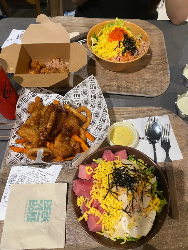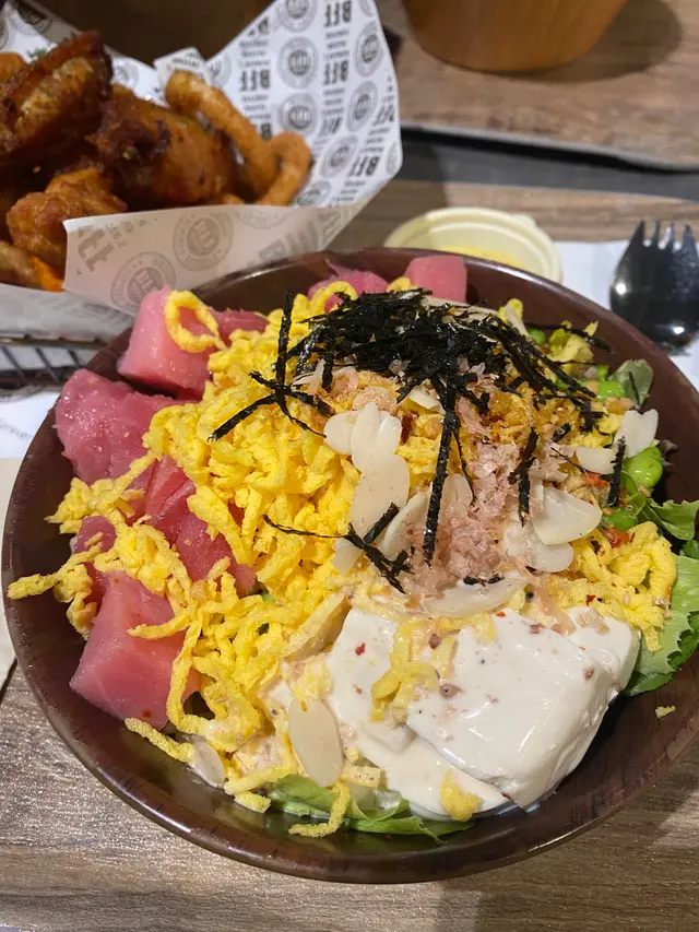 Quite like the idea of enjoying poke bowl in a foot court; enjoying fast food in a slow pace. Love the options they offer, self created or their choices. Mine was brown rice and salad base with tuna as protein and tofu, edamame and shredded egg as toppings with wasabi yogurt sauce. It was served in an enormous portion. We asked for sauce on a side and we only drizzled a bit. Mild wasabi creamy flavour and like the runny texture which didnt make the whole dish heavy and too rich. Greens were fresh and crunchy. Tofu was silky soft tofu already coated with Japanese sesame sauce. Very easy to tear apart during mix. Bowl was topped with loaded shredded egg. Was a bit difficult to mix it thoroughly because of the mountain amount of toppings. Tuna cubes were generous. Love that it wasn't marinated that might be salty to eat it on its own. I couldnt finish the brown rice, as too filling. We asked for fried chicken and cheese sticks as sides. Fried chicken was delicious. Well spiced seasoned batter well coated the chicken. Locked up all the moist. Even without their home sauce, it was absolutely delicious. Cheese sticks were okay. By the time I had it, it already set and cooled. Such a shame.Overall, quite a quality and filling 'healthy fast food'. 查看更多