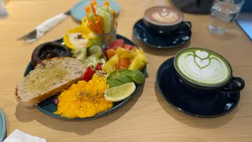 离远都见到cafe门口好特别有个大园窗可以望住街景用餐环境唔算好大不过坐得好舒服设计都系蓝色为主都几有feel💡-全日早餐有素同肉食今次同朋友拣左素嘅all day breakfast蛋好滑!~菇都好juicy软淋好香!水果都好新鲜好甜!-咖啡方面都唔错几香又甜度适中!👍🏻