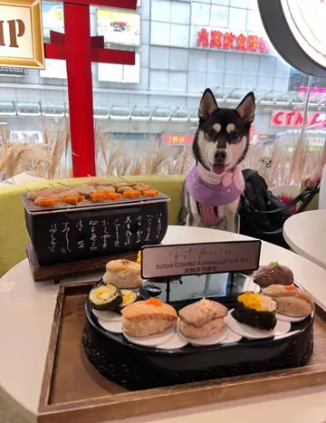 最后嚟到宠物餐 我哋4只小狗叫左回转寿司,个转盘真系识郁识转架🤪 啲食物卖相都好好,寿司上面系鱼/蛋/牛肉 下面系用鸡肉丸扮饭影完相小狗们急不及待抢住食,好快就清左碟了🤭