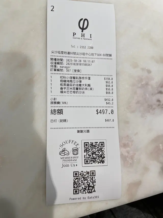 PHI Coffee & Pancake (尖沙咀中心) (尖沙咀) 网址: https://s.openrice.com/QrLS0a8SD00 地址: 香港尖沙咀麼地道66號尖沙咀中心地下G64-66號舖 电话: +852 63652380