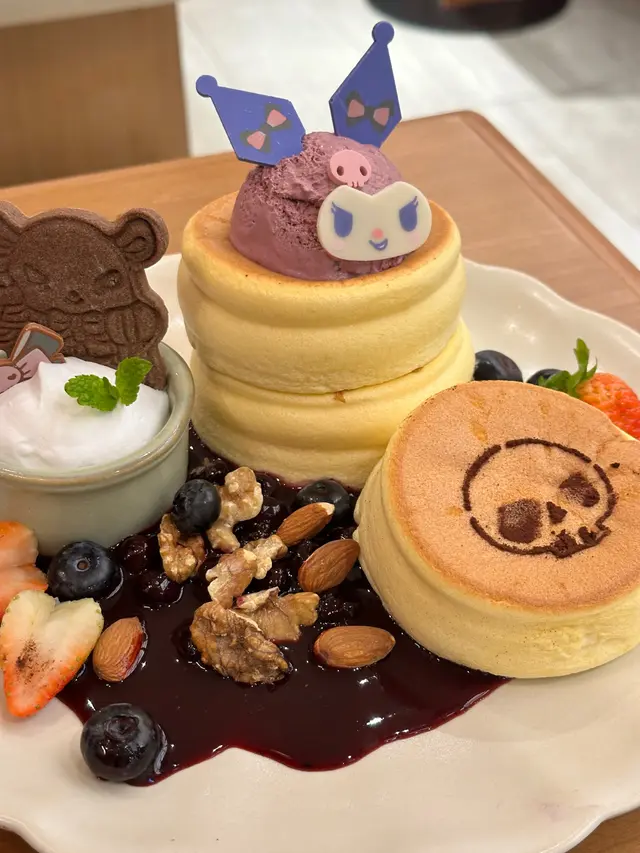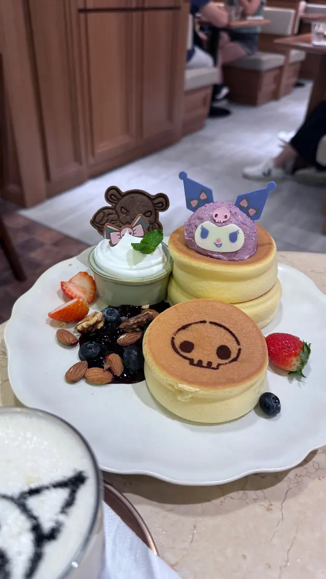 朋友仔超鍾意KUROMI 今次就嚟到旺角phi coffee pancake 朝聖 我都特登着咗紫色衫襯返可愛嘅KUROMI 唯一可惜係KUROMI 精緻意大利飯sold out所以我哋點咗其他嘢食💜KUROMI藍莓希臘乳酪梳乎厘 $175🖤與BAKU共享全日早餐$142💜KUROMI無花果藍莓沙冰$72🖤KUROMI紫薯咖啡$52💜芝士肉醬薯條$68🖤粉紅吞拿魚貓耳朵粉$112整體嚟講食物賣相精緻味道也相當不錯無花果藍莓沙冰讓我非常印象深刻 入口綿滑不會太酸 個人非常喜歡BAKU的小腿是用茄子做 茄子是烤過的 很香口查看更多