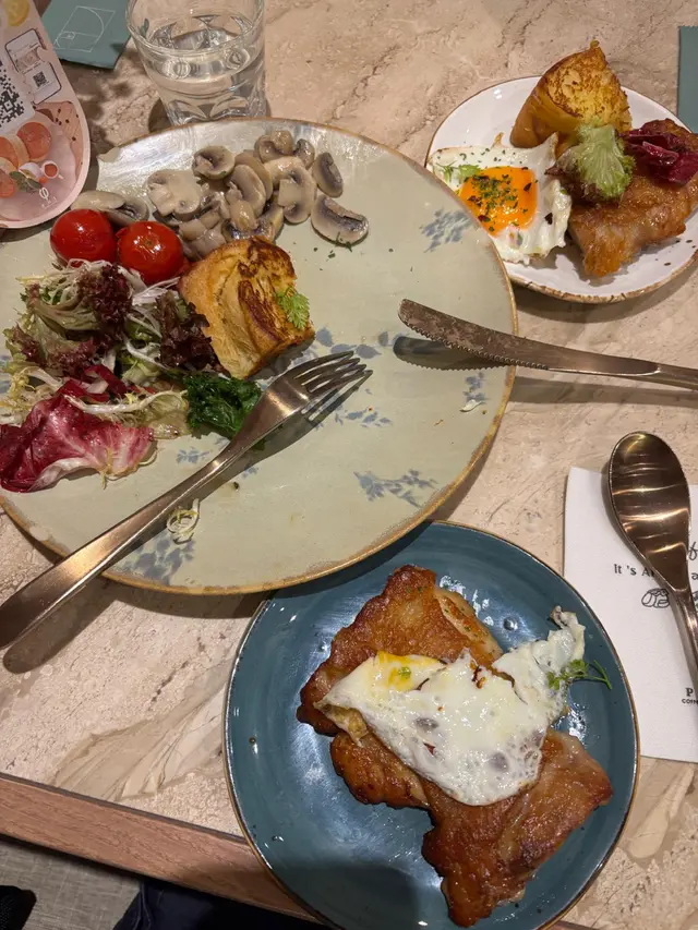 發現menu有D新款,心思思想試下新野,於是我哋兩個人叫咗一杯咖啡,雞扒早晨全餐,冬陰公海鮮意粉,最後當然唔少得海鹽梳乎厘
