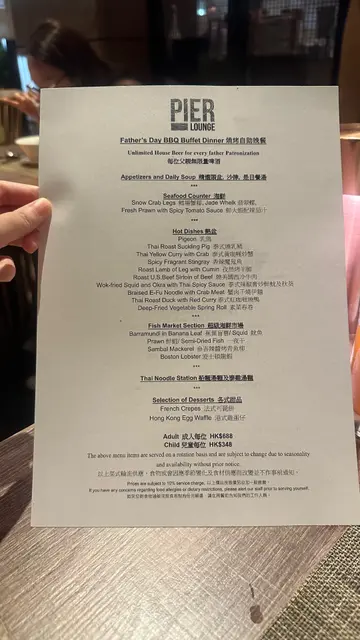 香港海洋公园万豪酒店Pier Lounge & Pier Bar嘅Father’s Day BBQ Buffet真系令人失望,选择少得可怜,完全唔似一间五星级酒店应有嘅水准佢话有海鲜同烧烤,但实际上得几款选择,冷盘嘅雪场蟹脚同热盘嘅龙虾系主打,但龙虾每次出得少得可怜,一放出来唔使十秒就无晒,等咗好耐都未见refill,简直系考耐性。更加失望嘅系,龙虾肉质唔系只只新鲜,食到有一只系d肉唔实好林pat pat烧烤方面,质素好普通。炒蟹都系啲劲细嘅蟹仔,蔬菜好似反而已经系最好。饮品方面更加离谱,竟然只有柠茶一种选择,连汽水都无,真系好无奈甜品特别啲嘅有法式薄饼同香港鸡蛋仔,选择少到令人无语整体黎讲,HK$688一个人嘅价钱真系完全唔值,服务一般,食物质素同选择都好失望,好彩系抢klook买一送一先试下佢姐。建议大家唔好试,揾其他地方食buffet会好过好多!