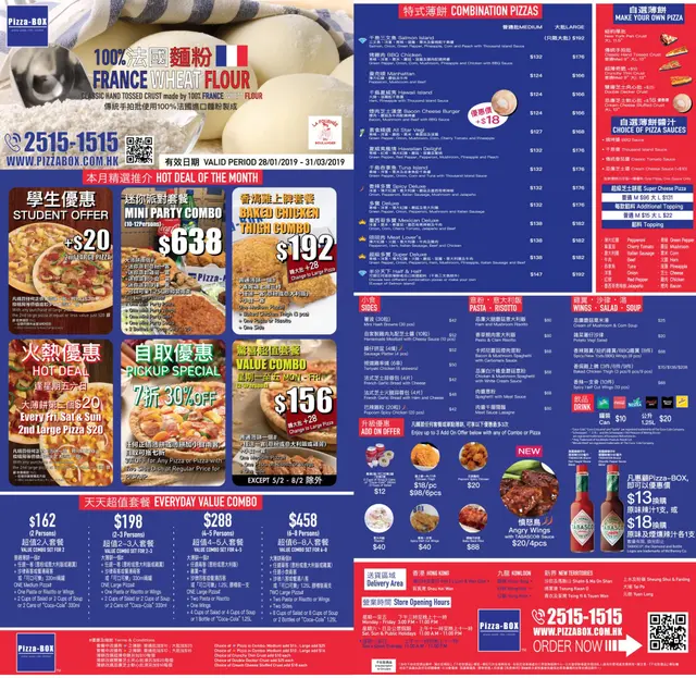 Pizza-Box (蕪湖街) (红磡) 网址: https://s.openrice.com/QrLS0X08000 地址: 香港紅磡蕪湖街191號裕新大廈地下H號舖 电话: +852 25151515
