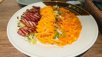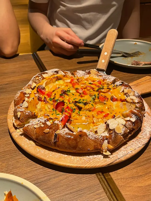 韩式Pizza 意大利粉🍕🍝非广告 自费的✨烟熏鸭胸泡菜卡邦尼意粉✨🍝卖相好靓仔😍 酱汁好creamy 但同时又充满住泡菜风味配以鸭胸粒同泡菜粒 会令人食到停唔到口略嫌烟熏鸭胸 熏得比较干 肉质变得有啲硬✨泡菜海湾芝加哥Pizza✨🍕Pizza 边同平时食嘅好唔一样 系蜜糖杏仁边上面有杏仁碎同糖粉 食落甜甜地 就咁食都觉得好好食😋!另外 芝士超级拉丝😍🧀入面有马苏里拉芝士,芝士条,炒洋葱,蘑菇,虾,蟹肉棒,菠萝,粟米,灯笼椒,火腿等等~~本身都谂个Pizza好似好细 2个人会唔会唔够食 点解2人分别食咗一块半就饱咗🤣 唔好俾佢嘅外表细细呃左😂😂…查看更多