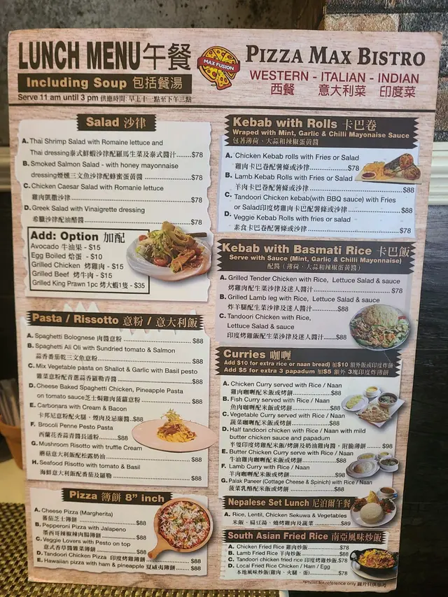 香港有很多印度和尼泊爾餐廳,偶然相約朋友一同吃印度菜和尼泊爾菜。今晚有朋友提出想吃尼泊爾菜,又想吃印度菜,於是上網搜尋發現佐敦有一間<Pizza Max Bistro>,提供多款薄餅、意大利菜、印度菜,還有尼泊爾菜。這間餐廳介乎佐敦站和柯士甸站,鄰近香港童軍中心。餐廳招牌挺耀眼,寫著西餐、意大利餐和印度餐,還有電話和地址。進入餐廳內,有種懷舊情調,格仔枱布。座位分了二人、四人和六人,適合三五知己一同品嘗美食和暢談的好地方。我們二人點了著名尼泊爾的特製醬雞餃(8件)、咖哩什菜煲和蒜茸烤餅。特製醬雞餃(8件)~饃饃餃子(MoMo)是尼泊人最愛吃的食物,這款餃子外皮薄煙韌,內饀雞肉滑溜,咬一口肉汁流出來。單獨吃餃子也不錯,點上自家製的辣醬,刺激味蕾,又提升餃子口感。朋友特別欣賞這款醬料,其餃子滿是辣醬。咖哩什菜煲~咖哩什菜煲的材料有紅蘿蔔、豆角、椰菜花、馬鈴薯、茅屋乳酪、洋蔥、番茄等。咖哩濃郁帶甜味的,並非香辣,非常適合不吃辣,又想吃咖哩及素食人士。蒜茸烤餅~四塊印度蒜茸烤餅一放上餐桌,已聞到濃濃蒜蓉牛油味,鬆軟又有嚼口。單吃已經很好吃,配上咖哩就更加美味。…查看更多
