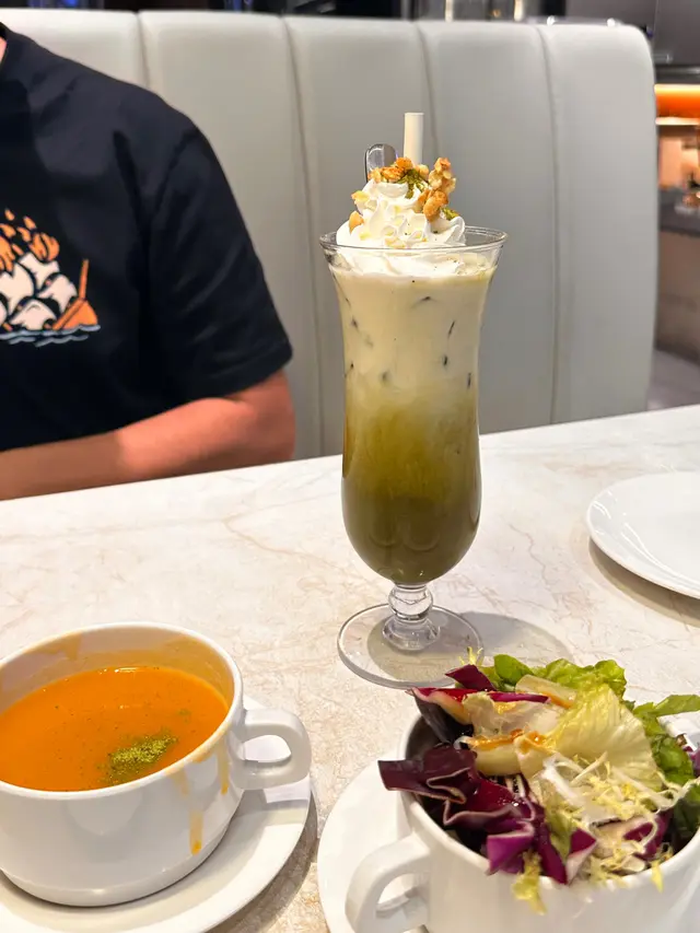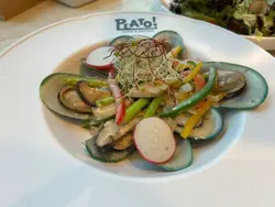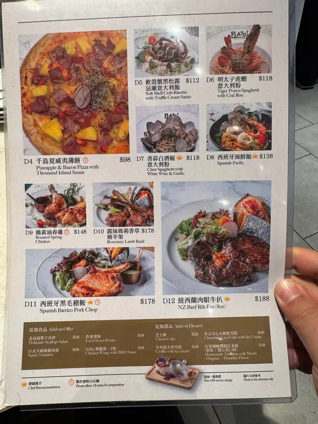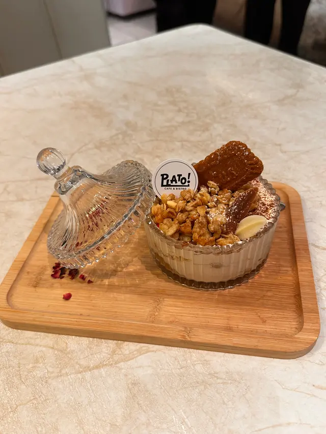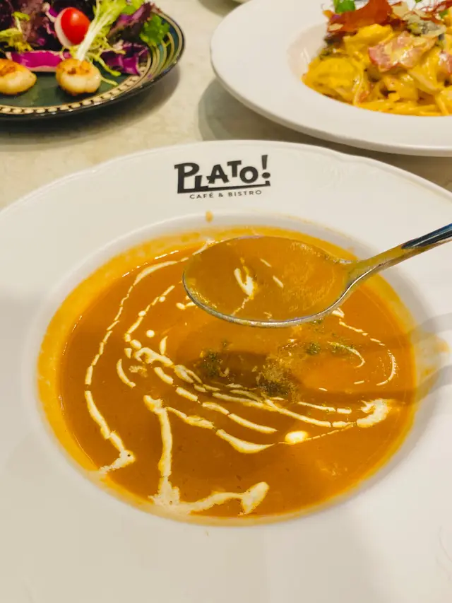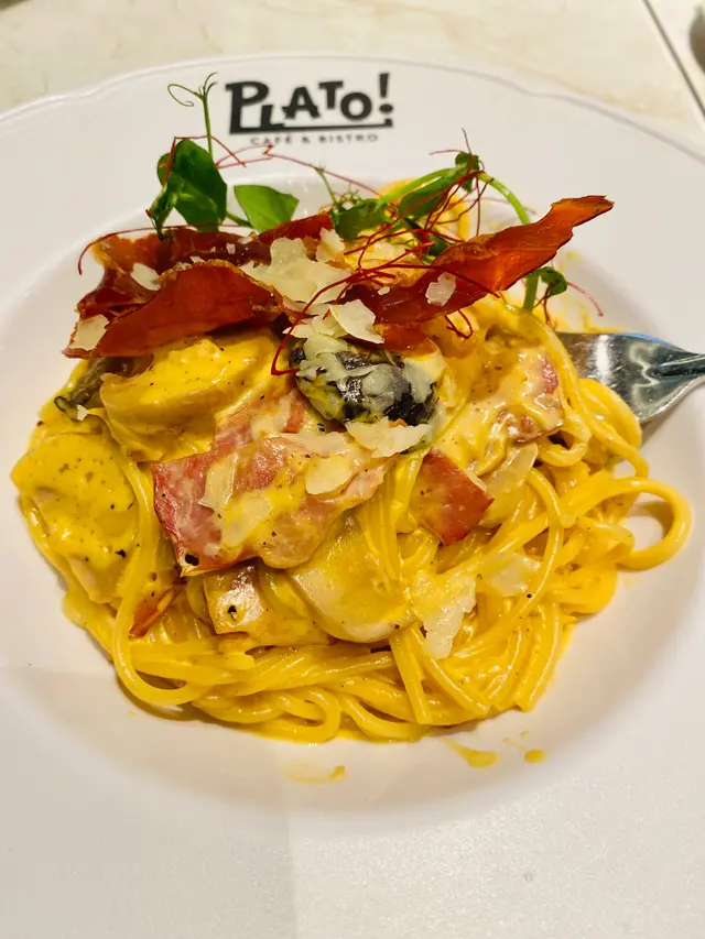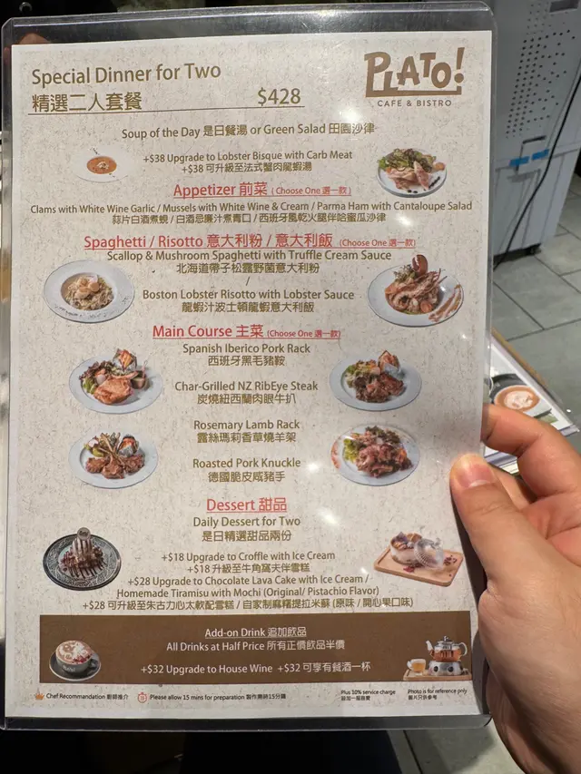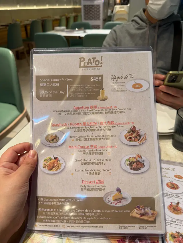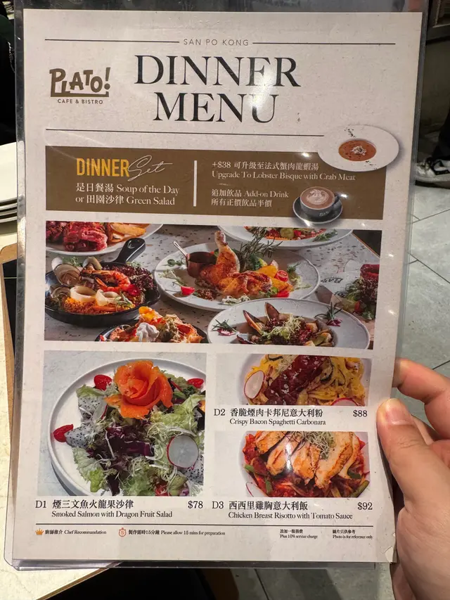 2025年12月3日 星期三最近同老婆去咗新蒲崗嘅 Plato Cafe & Bistro 食晚餐,環境真係幾靚,裝修走現代簡約風,木紋牆身配白色皮椅,坐得舒服又有質感天花掛滿橢圓形燈飾同節日裝飾,氣氛溫馨,啱晒朋友聚餐或者情侶約會整體乾淨企理,光線柔和,背景音樂唔會太嘈,一坐低就覺得好放鬆餐牌方面選擇多,主打西式料理,有單點又有二人套餐,前菜、意粉、主菜、甜品全部一應俱全,仲可以加錢升級湯品或者甜品,價錢合理,睇相片都覺得擺盤吸引,最後我哋就要左一個二人套餐一點完餐等左一陣,餐湯就送上,係南瓜湯湯身橙黃,入口滑溜,南瓜味自然香甜,唔會太膩灑上香草碎後多咗一層香氣,飲落暖笠笠,好舒服之後有前菜巴馬火腿蜜瓜沙律,火腿鹹香薄切,配埋清甜多汁嘅哈密瓜,鹹甜交錯好有層次,而且沙律菜新鮮,黑醋汁酸香醒胃之後就有北海道帶子松露野菌意粉,帶子煎得外脆內嫩,松露忌廉醬香濃但唔膩,野菌炒香帶出煙韌口感,意粉掛汁力強呢個係炭燒澳洲肉眼牛扒,牛扒外層炭香十足,肉質嫩滑多汁,油脂分佈平均配焗遠薯、蒸菜同肉汁,冷熱交錯,食落好滿足至於是日精選甜品既蛋糕層次分明,唔會太甜,中間既芝士帶香又輕盈另外配上玫瑰花瓣、朱古力棒同橙醬,視覺味覺都兼顧,係完美句號𣎴得丫提開心果白朱古力心太軟配雪糕,白朱古力漿流心效果真係一流,配合埋開心果碎同雪糕,冷熱交錯,口感豐富開心果醬微甜微鹹,令整體味道更平衡,打卡一流Plato Cafe & Bistro 無論環境定食物都令人滿意,菜式有水準,擺盤靚,味道有層次加上價錢唔算太貴,最啱想搵個地方慢慢食、影靚相、傾下計下次會想試埋其他主菜同甜品,值得回訪!!…查看更多
