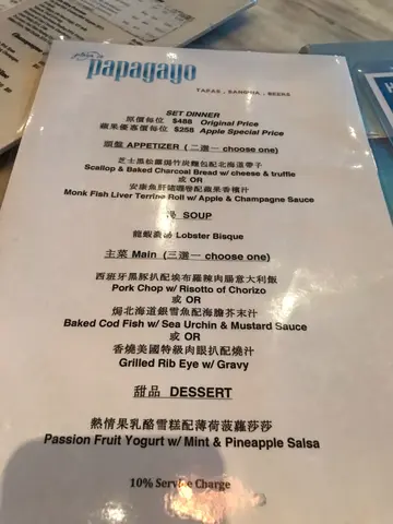 今天平安夜, 我公司好好, 不用上班。 多一日假期, 决定跟家人食一过丰富又悠闲嘅午餐。天文台道嘅 Papagayo, 平时经过已经好想帮衬, 呢度地方好大, 装修又靓, 有一种旺中带静, 都市绿洲嘅感觉。确实系尖沙咀食饭、朋友聚会、饮下嘢嘅一个很好嘅选择。好好彩, 一入到去就有一张全店最好嘅枱坐, 有梳化, 地方宽敞, 坐得舒服。估唔到临近大节, 都仍然有普通嘅午餐, 而且睇落唔错添, 所以我哋叫咗两个lunch sets, 然后再加两份 a la carte 嘅食物。Set lunch 嘅餐汤、沙律菜、巴马火腿、水果, 系自助任攞, 种类都几充足, 食到三点都钟都仲会添加。杂菜汤好好味。餐包够热, 配上非常好味嘅香草牛油, 简直系绝配。<西班牙海鲜饭> 用了足, 味道够。虾够又大只, 又爽甜。<香草汁鲈鱼柳并薯菜沙律> 香煎鲈鱼柳美味非常, 肉质实在, 有口感, 似石班扒。香草汁味道清新特别。 配菜中嘅薯仔好好味。<香煎鹅肝安格斯免治汉堡并薯条> 鹅肝好厚身, 烹调时间啱啱好, 配上新鲜番茄汁蔬菜, 感觉唔会太油腻。免治牛肉份量少咗啲, 及生咗啲。薯条好好味。<八味吐司> 一个好特别嘅菜式, 可以品尝都好几种西班牙嘅小食, 配以面包。…查看更多