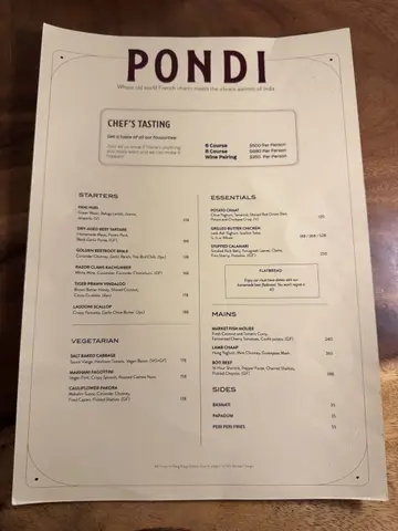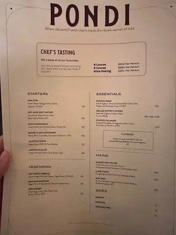❀ Pondi #西环 ❀❗三访惊喜印度法式fusion菜 三年嚟依旧$680八道菜❗——————————————————三访嘅Pondi依然冇令我失望🤩主打创新印度法国菜,将印度菜以法式烹调手法呈现。三年嚟tasting menu价钱维持不变,6道菜$500,8道菜$680,价钱合理仲饱到上心口🥰而且可以同侍应讲你想食嘅菜式,餐厅会尽量配合👍🏻餐厅位于西营盘街角,环境较细,但充满欧陆风情。.八道菜嘅套餐有四款前菜、两道主菜以及甜品,每款都充满特色,有惊喜✨前菜先有印度经典小食Pani Puri ,鹰嘴豆脆球中倒入特制薄荷青酱,香脆清新。Beef Tartare 口感creamy非常出色,底层嘅千层薯仔系我食过最香脆惹味🥰再有一款新推出嘅蔬菜Ratatouille,青瓜、蕃茄切片配搭乳酪酱,爽脆可口。仲有Octopus 🐙表面香脆肉质爽弹,配香甜嘅南瓜酱及印度香料,味道丰富,伴菜嘅薯仔都非常软腍入味。.主菜唔少得餐厅招牌菜Stuffed Calamari🦑鱿鱼筒酿着香口肉碎及开心果,口感复杂。用Flatbread点埋烟腩肉及蚬肉熬煮嘅汤汁,更滋味!另外仲有经典印度菜Butter Chicken🍗鸡肉预先烧香,肉质尚算嫩滑,嚟到呢度已经超级饱!.最后再有中东经典甜品Almond Baklava,酥皮搽上糖浆、果仁及椰奶。呢款甜品一向偏甜,但呢间都算平衡不错。.✷𝑀𝑒𝓃𝓊✷☞ 6-course Tasting Menu $680♥ Pani Puri♥ Dry-aged Beef Tartare♥ Ratatouille♥ Octopus ♥ Stuffed Calamari♥ Flat bread ♥ Grilled Butter Chicken ♥ Almond Baklava——————————————————✨整体味道: 4.1/5 ✨环境装修: 3.9/5✨服务态度: 4/5✨性价比: 4.2/5✨再访兴趣: 4/5 .💞整体来讲菜式创新,味道丰富浓郁。钟意印度菜但又想有啲新意,或者喜欢fusion菜嘅你,呢间餐厅一定满足到你!…查看更多